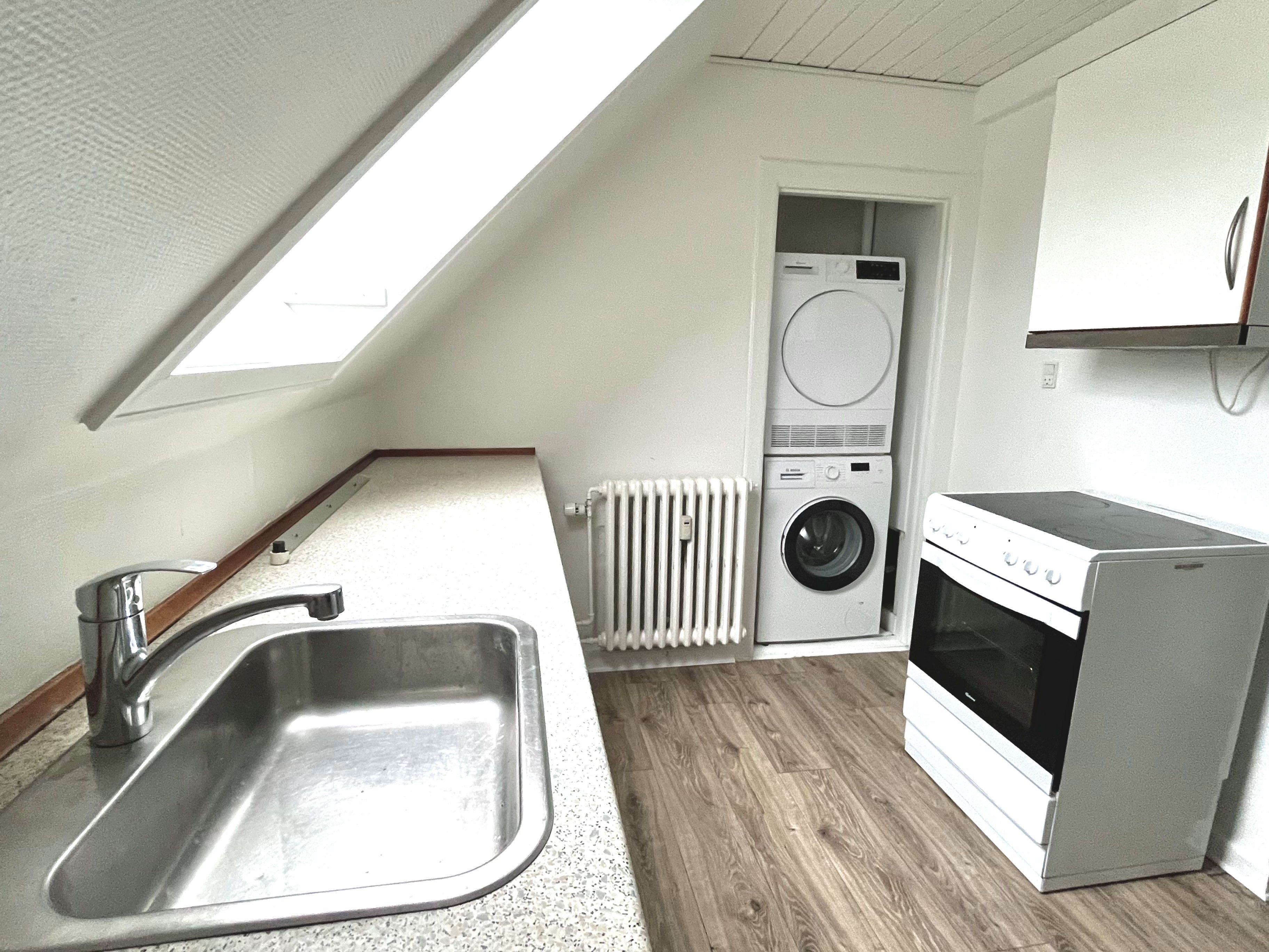 Nu udlejes en pæn lejlighed på 1. sal beliggende i roligt gårdmiljø tæt på centrum af Horsens by. Lejligheden er i pæn stand med nyt hvidt køkken og pænt bad. Lejligheden har fritlagte hanebjælker, der giver en hyggelig stemning. Lejligheden har egen indgang via udvendig ståltrappe. Køkken og stue er i åben forbindelse. Herudover 2 værelser, dog således at det ene værelse er med gennemgang til det andet. Vicevært tilknyttet til ejendommen, så alt holdes pænt og ordentligt. Vaskemaskine og tørretumbler til rådighed i fælles vaskerum. Der er professionel administration der står til rådighed alle hverdage. Vicevært passer ejendommen og området.