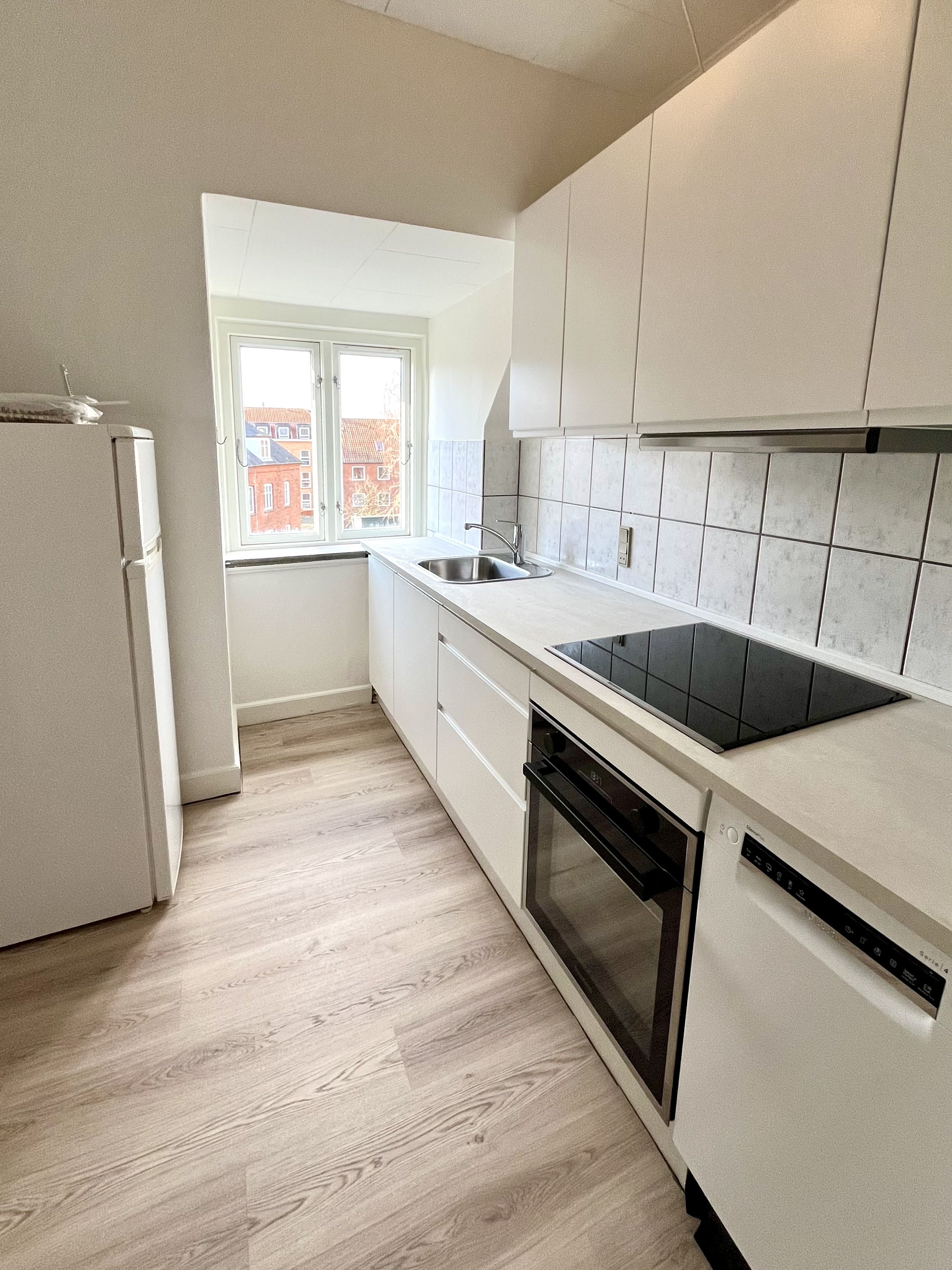 Hvis du er vild med duften af nymalede vægge og følelsen af at være den allerførste, der sætter tænderne i et køkken, så skal du læse videre her. Vi er nemlig gået i gang med den helt store tur i stuelejligheden, og vi stopper ikke, før alt spiller 100 %. Vi snakker spritnyt køkken med alt i hvidevarer (ja, du slipper for opvasken!), et lækkert nyt badeværelse med friske klinker og nye laminatgulve i resten af lejligheden. Det bliver simpelthen så fedt, at vi næsten overvejer selv at flytte ind. Vi ryster posen og ændrer planløsningen, så du får to gode soverum og en lys stue. Det gør lejligheden helt genial til det kræsne par, men også for dig, der gerne vil dele med en makker uden at skulle slås om det største værelse. Da vi lige har svinget hammeren for første gang, skal du tage plantegningen som en kvalificeret profeti – der kan ske små ændringer undervejs, men vi lover, at resultatet bliver i topklasse. Som om det ikke var nok med indendørs luksus, får du også din helt egen altan til de lune aftener. Og hvis du får lyst til at mærke græs mellem tæerne, smutter du bare ud i den hyggelige baghave, som du deler med de to andre beboere i ejendommen. Du bor tæt på Horsens centrum, men stadig i ro og mag. Vil du være med fra starten og sikre dig ejendommens absolutte opgradering? Så er det nu, du skal slå til – før malingen overhovedet er tør! (Da renoveringsarbejdet pågår, er indflytningsdatoen et skøn og kan både blive tidligere og senere, alt efter hvordan arbejdet skrider frem - lad os få en snak om det. Herudover gøres der på det kraftigste opmærksom på, at de fremviste billeder af køkken og badeværelse er fra andre lejemål, men vises for at illustrere, hvilke materialer mv. der vil blive brugt)