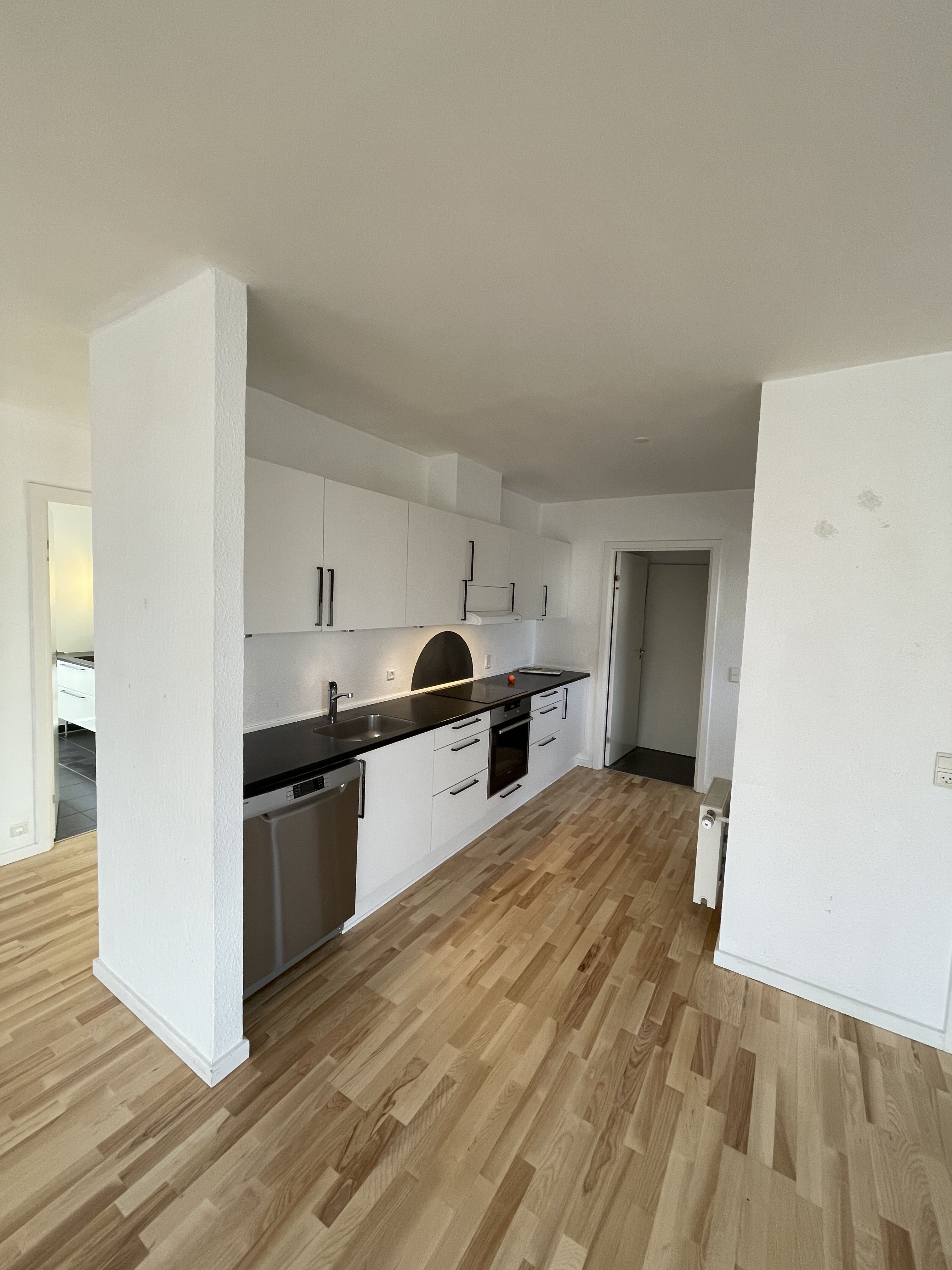 Rummelig og lækker treværelses lejlighed med et stort og indbydende leverum, der forener både køkken, spiseplads og stue. Køkkenet er placeret i en vinkel, der åbner op mod resten af rummet.