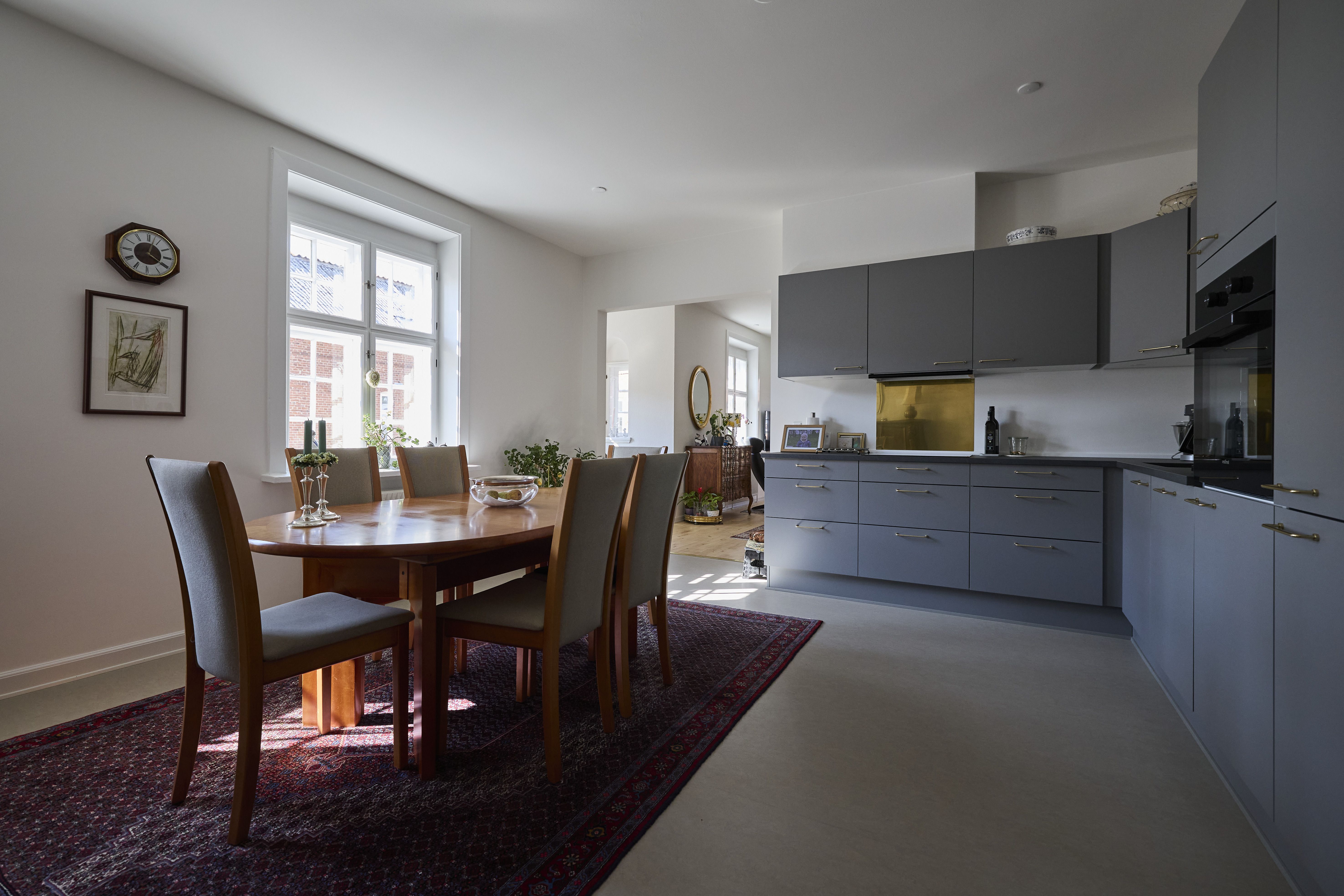 I lejlighedens køkken-alrum er den hvide køkkenløsning fra HTH med til at understrege den lyse stemning af rummelighed og eksklusivitet. Med moderne løsninger som indbygningsovn, induktionsplade, opvaskemaskine og køle/fryseskab fra Electrolux får du en gennemført køkkendrøm.