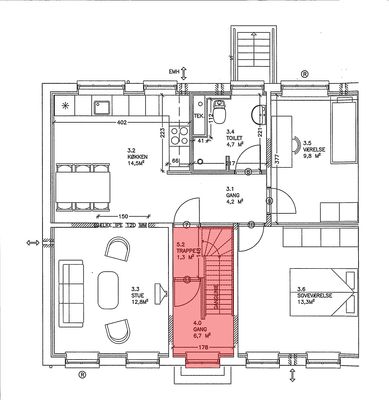 Den 96 m2 store lejelighed indeholder entre, badeværelse, køkken-alrum med spiseplads, stue/værelse og soveværelse.