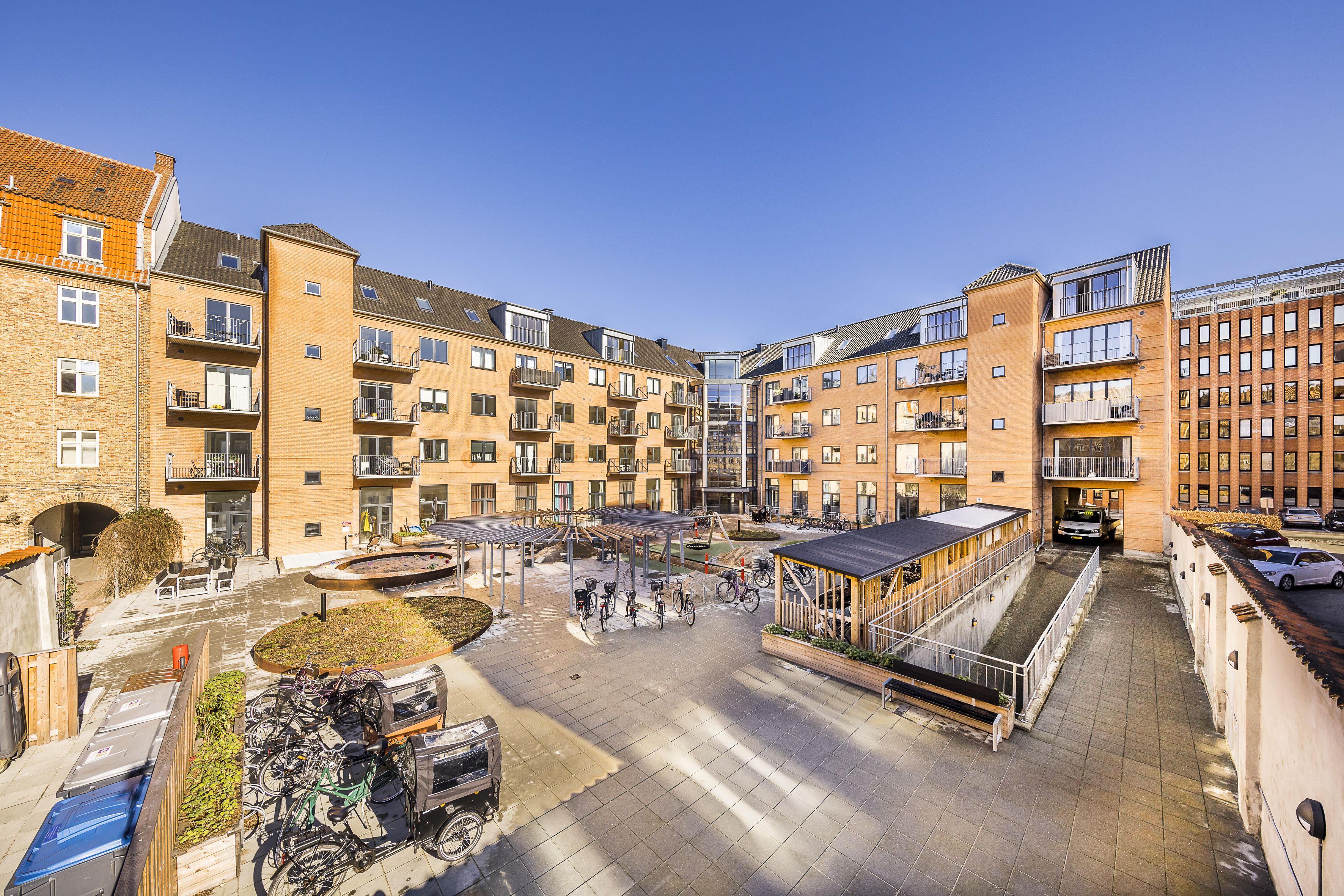 Bag ejendommen har du adgang til et smukt grønt fællesareal, hvor du kan nyde udendørs aktiviteter eller blot slappe af i fredelige omgivelser. Dette grønne område er ideelt til socialt samvær og giver en følelse af at bo midt i naturen, selvom man er tæt på byen.