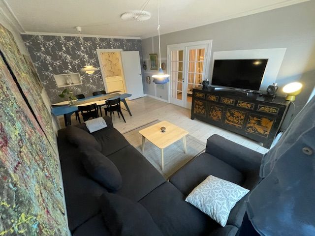 Lejligheden indeholder: Entré, der leder videre til et smukt og lyst køkken/alrum med alle hårde hvidevarer, stilren kogeø og en elegant buet karnap, som giver et fantastisk lysindfald. Køkken/alrummet er integreret med lejlighedens stue og skaber et åbent og indbydende opholdsrum. Lejligheden rummer to lyse og indretningsvenlige værelser med indbyggede skabe. Badeværelset er flot renoveret med separat bruseniche og samt både vaskemaskine og tørretumbler.