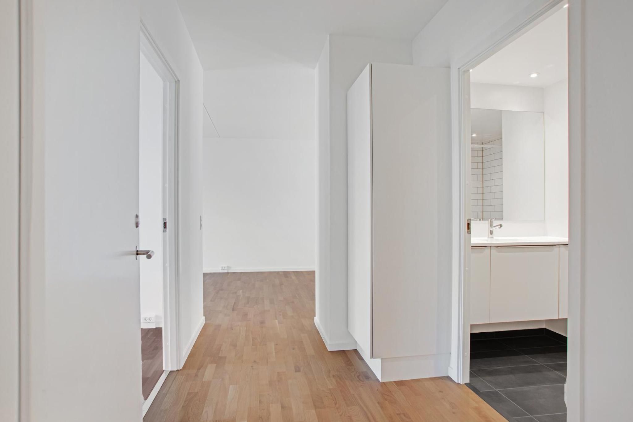 **Stilren lejlighed i Valby** Midt i Valby finder du denne nybyggede ejendom, der rummer en dejlig lejlighed. Her kan du se frem til en optimal planløsning og lækre materialevalg, og dette antal værelser er boligen oplagt til både parret eller den lille familie. Den skarpe ejendom er opført med en murstensfacade samt metalplader på øverste etage, hvilket bidrager med en rå kant til byggeriet. Udenfor bemærker du de rigelige vinduespartier samt altanerne, der bryder facadens monotoni. Entréen ligger i åben forbindelse med resten af boligen, og den fremtræder endvidere med god plads til overtøjet i det faste skab. I badeværelset er der bruseniche og plads til en smart vaskesøjle. Soveværelset brillerer med sin sublime størrelse og det fabelagtige lysindfald. Det er i opholdsrummet, at langt de fleste kvadratmeter udfolder sig via en lys og moderne indretning med et flot gulv og pragtfulde vinduespartier. Køkkenet er pladsbesparende indrettet langs den ene side, og således præsenterer det åbne opholdsrum sig som en spændende oase med et væld af indretningsmuligheder. Stuen er trefoldigt herlig med indgang til et funktionelt depotrum, et bredt vinduesparti og en terrassedør, som fører ud på den sydvendte altan med vue til nabolaget. Den bynære placering giver dig mindre end en halv kilometer til daginstitution, skole og MENY. Samme afstand fører dig til Valby Station, og nærområdet byder endvidere på lækre caféer ved Valby Langgade samt skønne shopping-muligheder i Spinderiet. OBS! Billeder, plantegning og tekst er vejledende og kan afvige fra boligens faktiske forhold. Hvis du er registreret i RKI kan vi desværre ikke tilbyde dig lejligheden. Dette kontrolleres ved udarbejdelse af lejekontrakt.