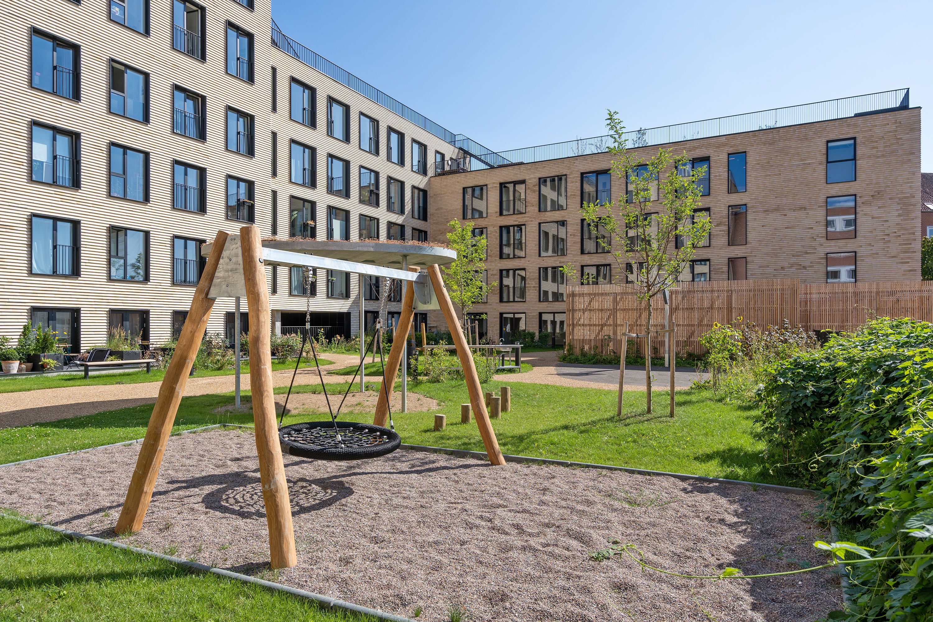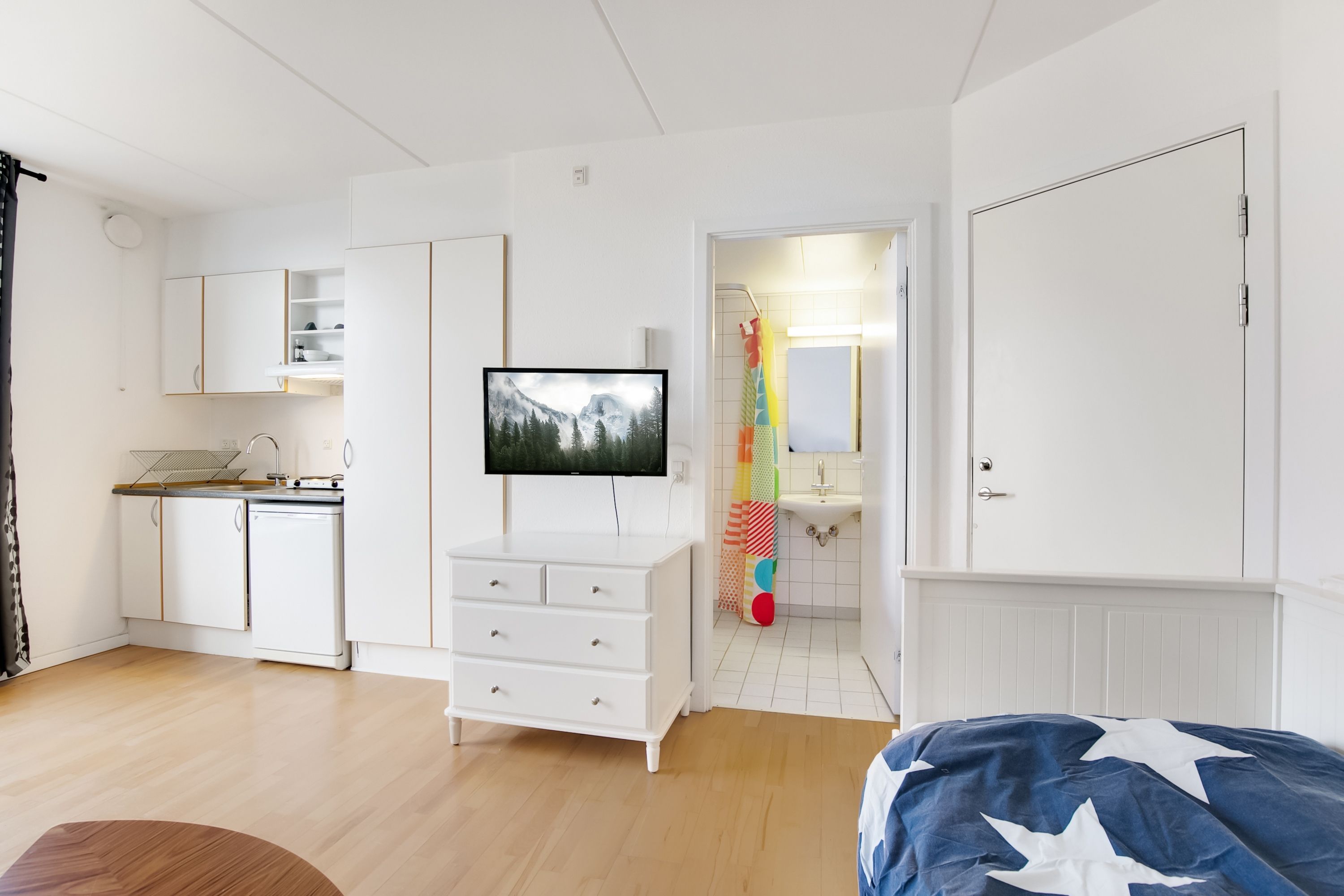 Vælg denne umøblerede lejlighed og indret dit hjem, præcis som du ønsker det. Det store vinduesparti giver et godt lysindfald og de veldisponerede kvadratmeter gør at du kan skabe det hjem der passer til dig og dine behov. Lejligheden kommer med et mindre køkken med to induktionskogeplader, håndvask, overskab samt køle/fryseskab. Derudover er der et rummeligt badeværelse med toilet, bruseniche og håndvask med integreret underskab. Alle vores beboere har adgang til fælleskøkkener, vaskeri, lounge – og arbejdsområder samt tre store tagterrasser med fantastisk udsigt over byen.