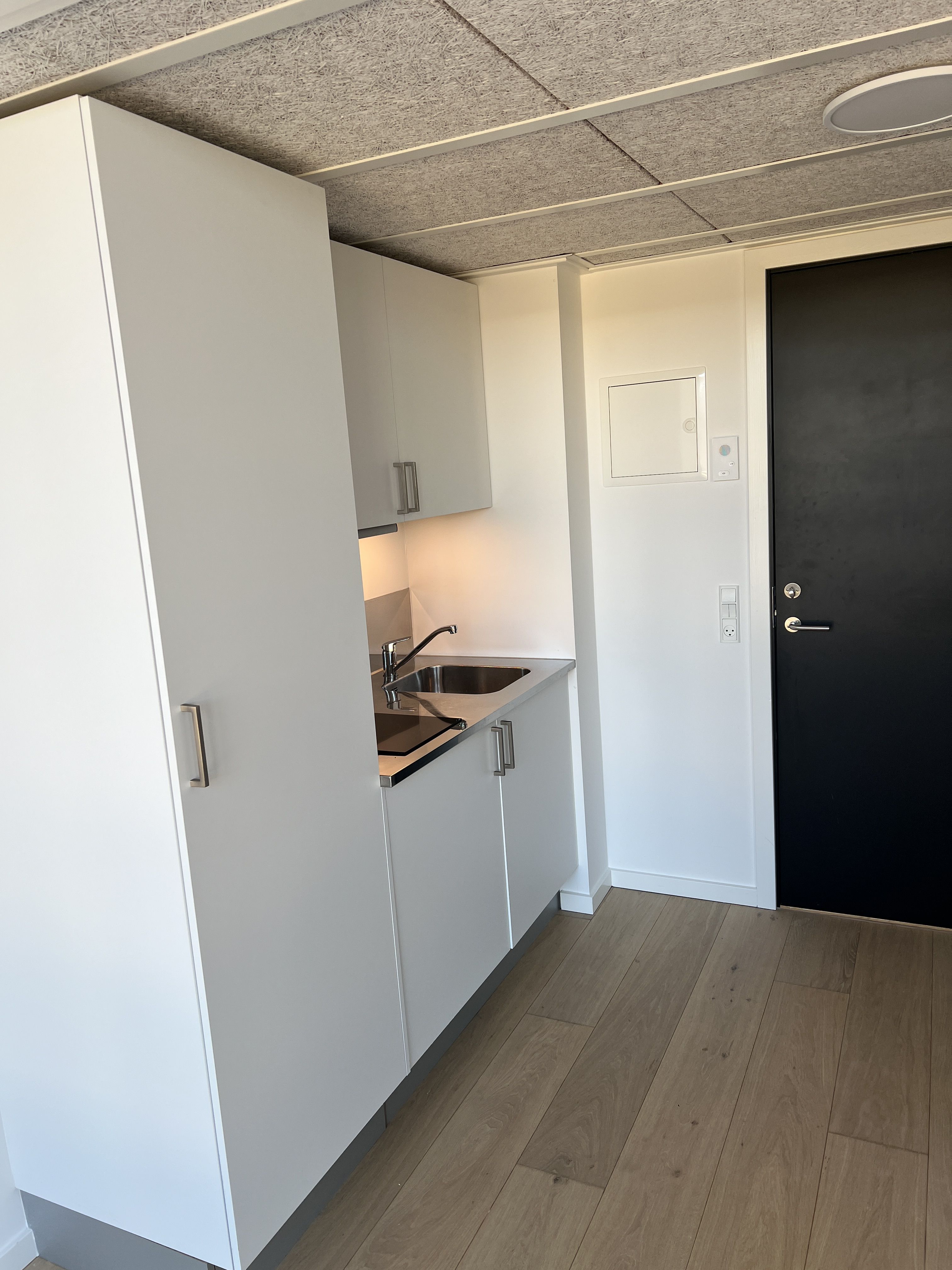 Denne møblerede lejlighed har alt hvad du skal bruge for at skabe et nyt hjem. Her behøver du kun at medbringer dine egne personlige ejendele – vi har sørget for resten. Lejligheden er på 31 veldisponerede kvadratmeter og kommer med et mindre køkken med to induktionskogeplader, håndvask, overskab samt køle/fryseskab. Derudover er der et rummeligt badeværelse med toilet, bruseniche og håndvask med integreret underskab. Lejligheden er derudover møbleret med følgende: - Seng - Spisebord - Spisebordsstole - Lænestol - Garderobeskabe - Reol - Hylder - Loft belysning - Gulvlampe - Natbord - Extra køkkenbord - Mikroovn - Gardiner - Badeforhæng Alle vores beboere har adgang til fælleskøkkener, vaskeri, lounge – og arbejdsområder samt tre store tagterrasser med fantastisk udsigt over byen.