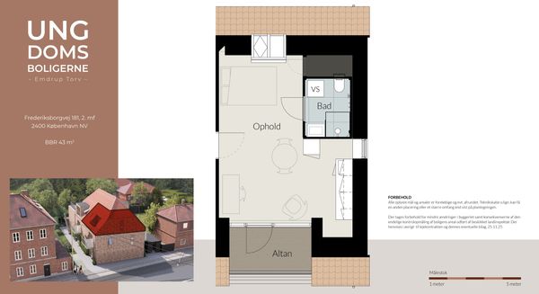 Lækker 1 værelses lejlighed tilbydes til rolig lejer fra 1/4-26. Lejligheden er beliggende på Frederiksborgvej, lige overfor Emdrup Torv, hvor der er mulighed for bus i alle retninger. Fra ejendommen er der ca. 800 meter til Emdrup Station. Ejendommen er nyopført i kvalitets materialer både ude og inde. På lejlighedens kun 36 kvm er der blevet plads til et fornuftigt badeværelse med plads til installation af vaskesøjle, samt et komplet køkken med kogeplade, emhætte, ovn og opvaskemaskine. Gulvene er Moland vinyl i høj kvalitet, så der vil ikke være en udgift til slibning af gulve ved fraflytning. Fra lejligheden er der direkte udgang til en lille privat terrasse. Varmeforbruget i ejendommen er minimalt, da lejligheden er nyopført og derfor overholder de nyeste krav til energioptimering.