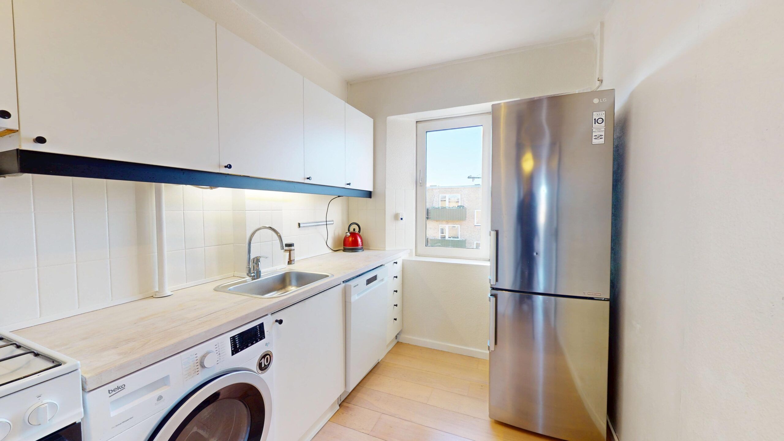 Adgang til fælles møbleret terasse, indendørs cykel parkering og vaskekælder inkluderet i huslejen.