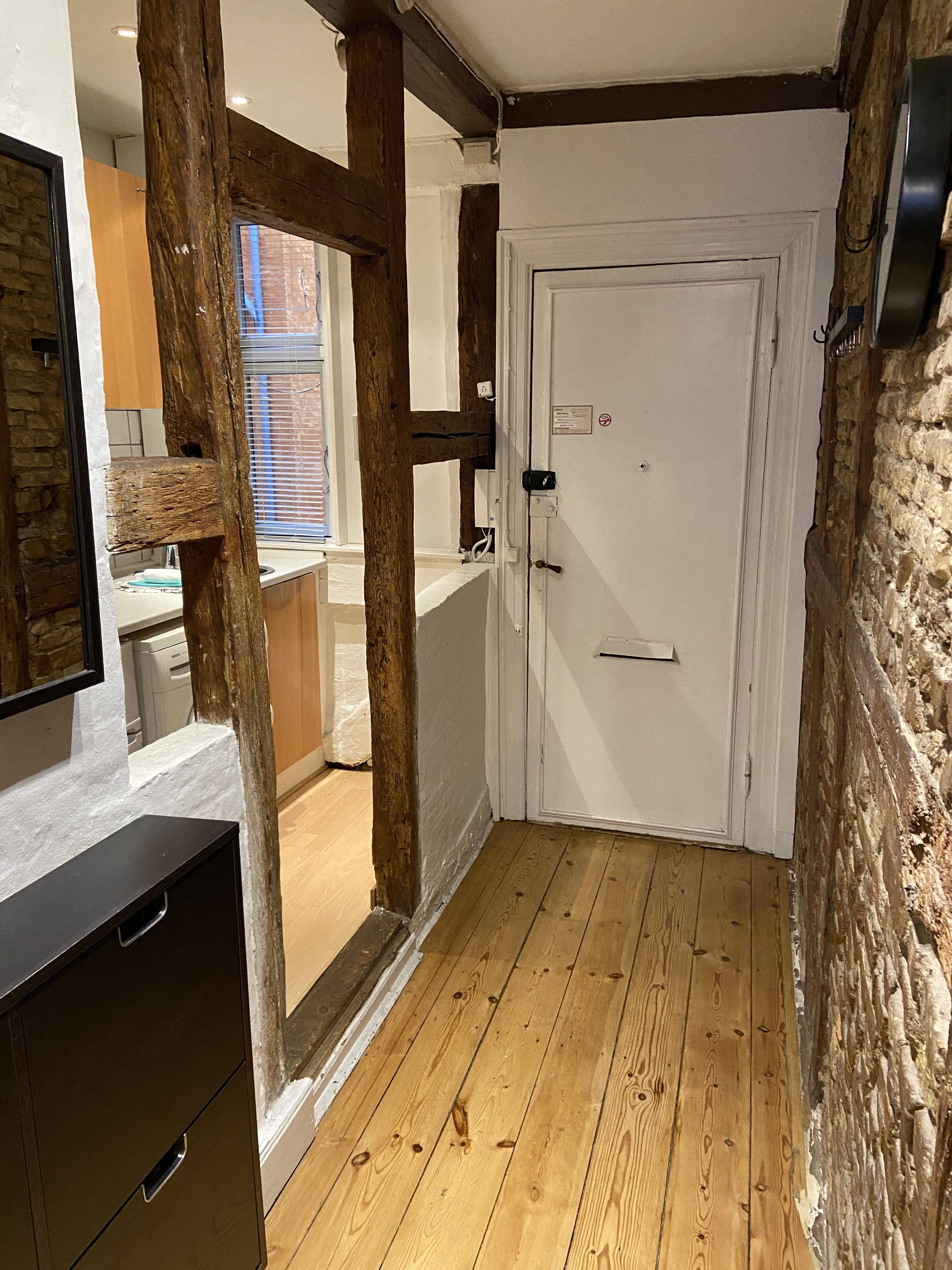 The apartment opens into a small entrance hall that connects to the bedroom, bathroom, and kitchen/living area. The kitchen has been recently remodeled and is part of a large open-plan kitchen and living space. As the renovation is recent, the living/dining area is currently unfurnished, giving you the freedom to furnish and arrange it to your own taste.