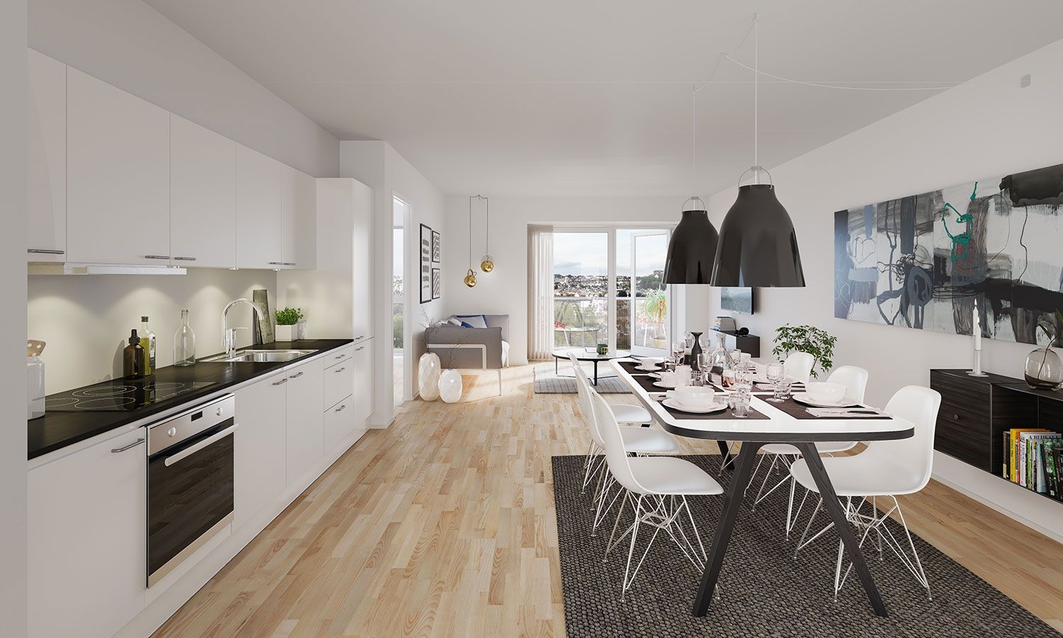 - Stor, lys stue med åbent køkken og spiseplads