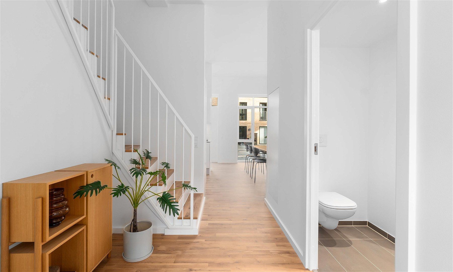 Badeværelset er udført i hvide elementer, som giver et flot og eksklusivt