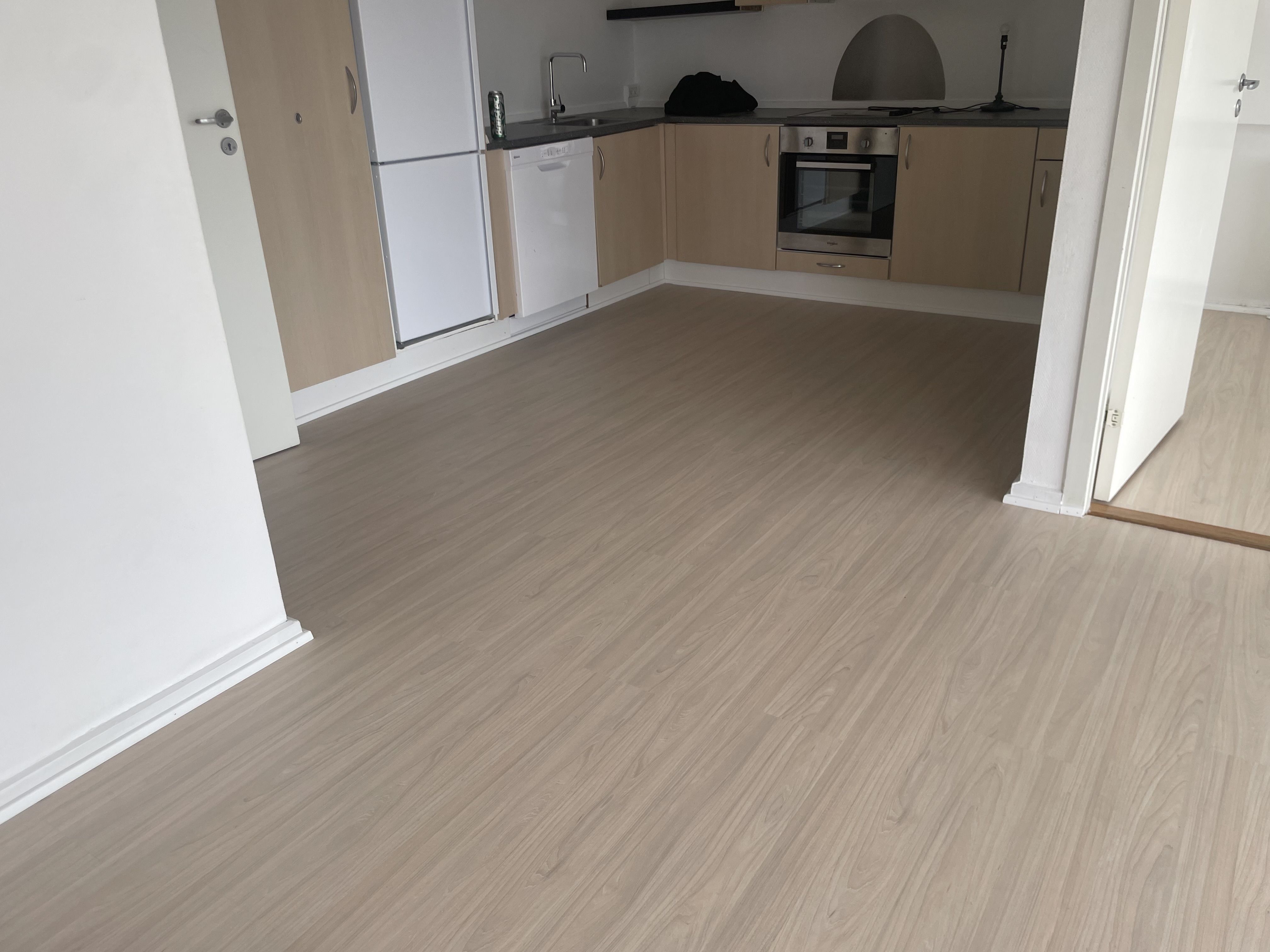 Stor lys 1. sals lejlighed. Lejligheden indeholder stort køkken med spiseplads og i åben forbindelse med stuen, to værelse med skabe og badeværelse med bruseniche. Lejligheden er indrettet med TVIS-køkken og garderobeskabe, hvidmalede vægge og trælaminat på gulvene. Desuden medfølger keramisk komfur, emhætte, stort køle-/fryseskab og opvaskemaskine. Lejligheden har egen indgang og adgang til fælles vaskeri samt depotrum i kælderen. Alt forbrug betales direkte til leverandør. Det er ikke tilladt at holde husdyr. Det er ikke tilladt at ryge i lejligheden.