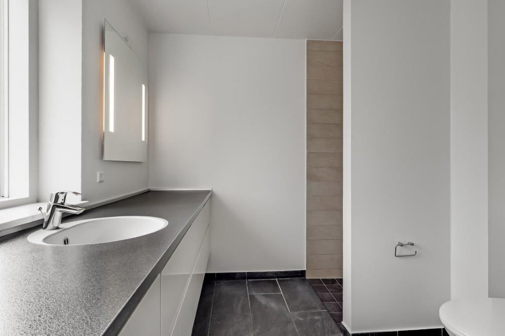 - Stort badeværelse med vaskesøjle og god skabsplads
