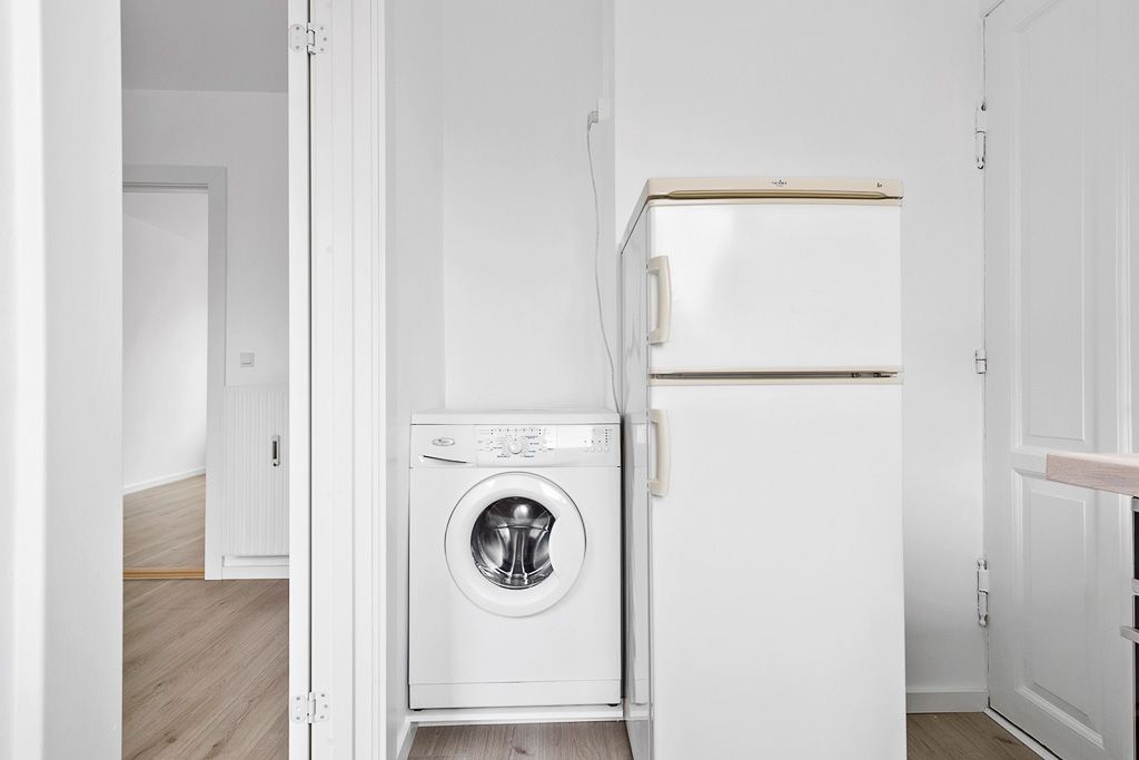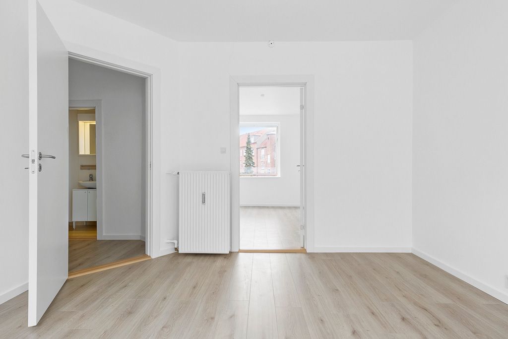 Lejligheden består af 2 værelser med flotte trægulve, hvide vægge og skønt køkken med nye hvidevarer (køl/frys, komfur med glaskeramisk kogeplade og vaskemaskine). Badeværelse med bruseniche.