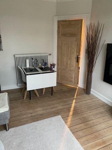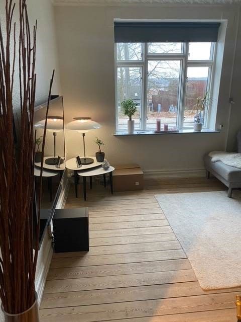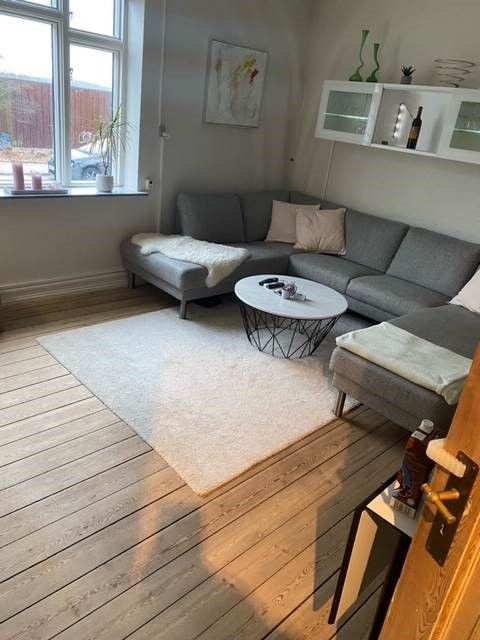 Opholdsstuen er indretningsvenlig med plads til både sofaarrangement og spisebord, og fra rummet er der direkte udgang til altanen, så udearealet bliver en naturlig forlængelse af hverdagen. De lyse gulve og det gode lysindfald skaber en behagelig atmosfære i rummet.