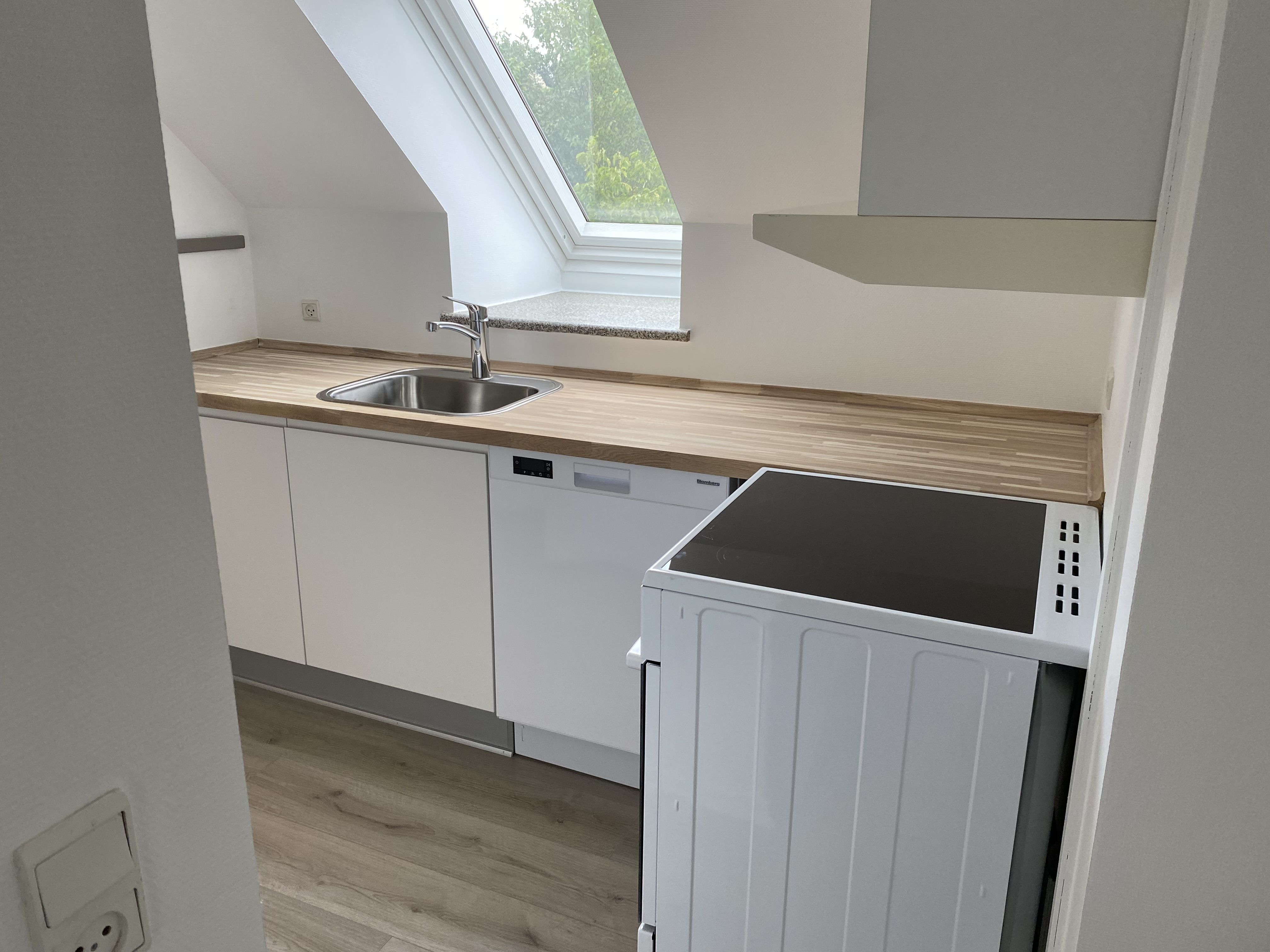 Køkkenet er velholdt og lyst med hvide elementer, god skabs- og bordplads, samt opvaskemaskine. Vinduet giver et naturligt lys i køkkenet samt udsyn til det grønne fællesareal. Badeværelset er kompakt og funktionelt med brus, samt et glasparti, der sikrer naturligt lys.