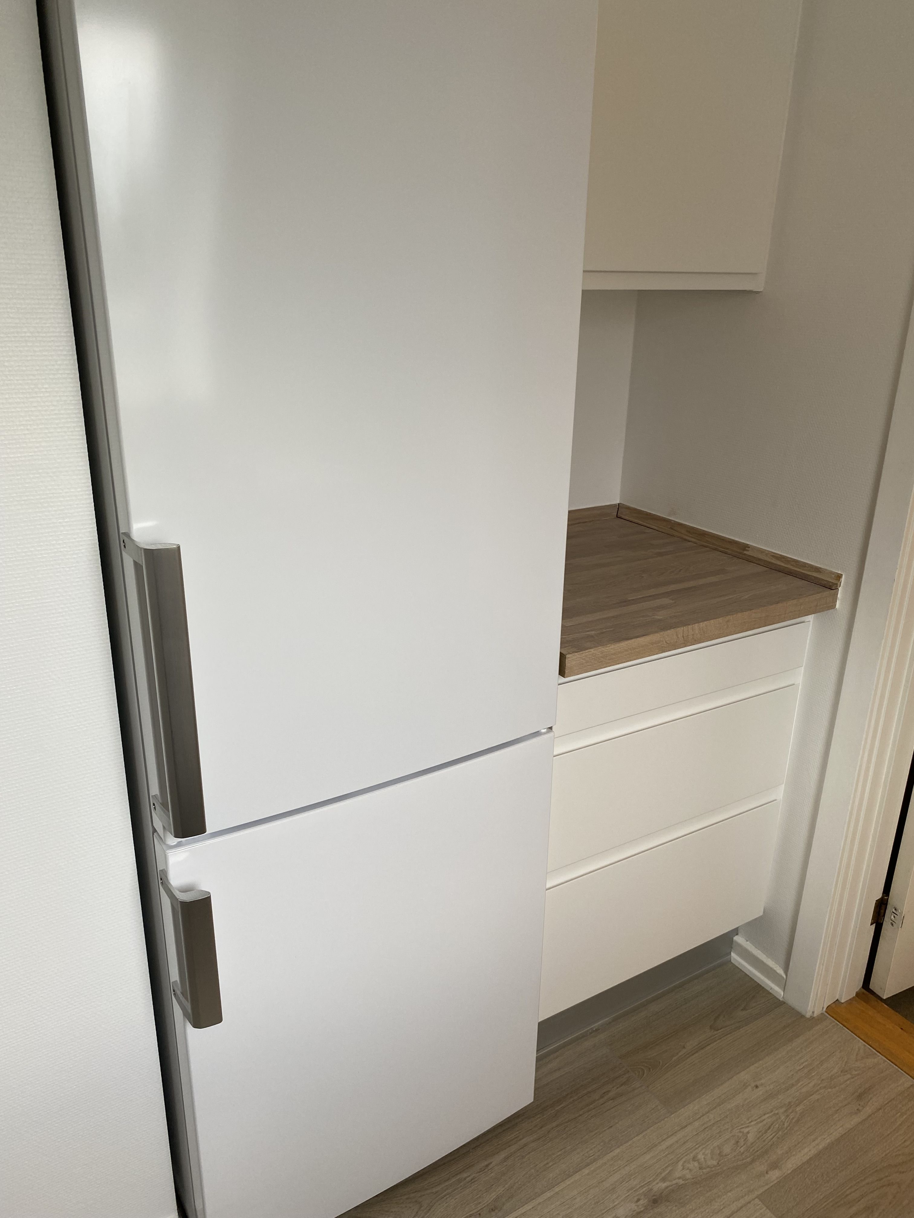 Fra køkkenet kan man gå ned til fællesområdet, cykel- og vaskekælder, samt kælderrum.