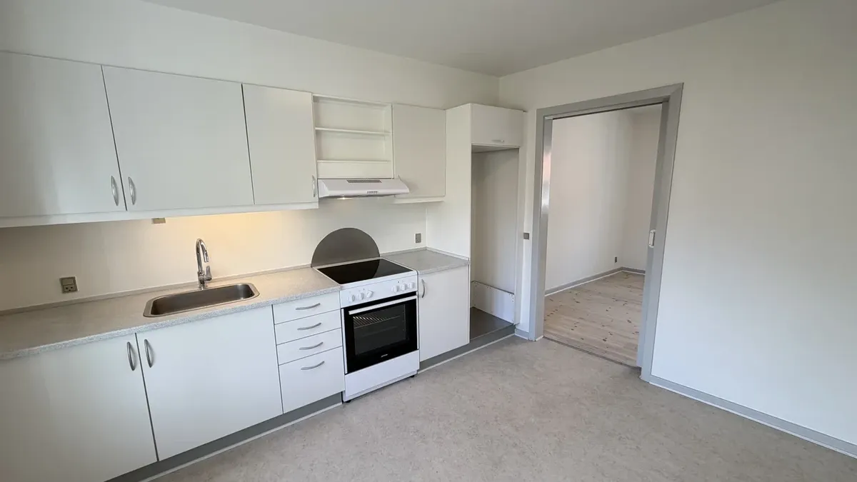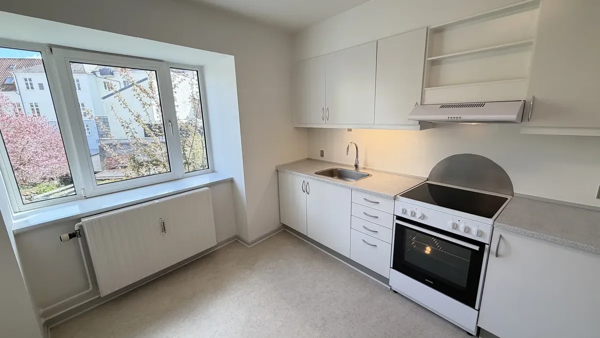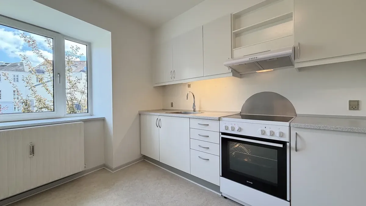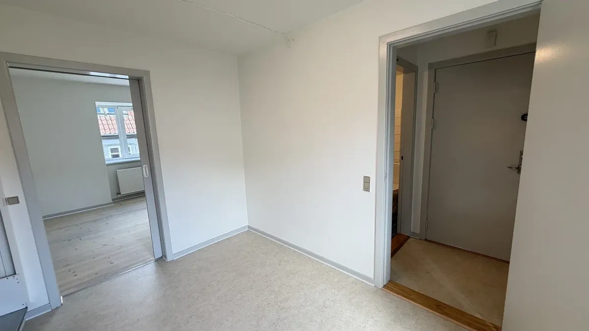 Velkommen til en velindrettet og indflytningsklar lejlighed på 66 m2. Planløsningen rummer en entré med plads til overtøj, en rummelig stue, et soveværelse i god størrelse, et pænt badeværelse samt et separat køkken med plads til mindre spiseplads ved vinduet. Overalt mødes du af lyse trægulve, store vinduespartier og en behagelig loftshøjde, som tilsammen giver et venligt og luftigt hjem. Stuen er lys og let at indrette med sofa- og TV-zone, og det brede vindue giver et fint kig til byens klassiske murstensbygninger. Soveværelset har ligeledes et stort vindue og god plads til seng og opbevaring, samt adgang til altan/terrasse. Badeværelset fremstår pænt og funktionelt med separat bruseniche, lys flisebelægning, spejl og skabsplads – enkelt og praktisk i hverdagen. Køkkenet er indbydende og veludnyttet med mørke fronter kombineret med varme trædetaljer, god bordplads, ovn og kogeplade samt opvaskemaskine. Ejendommen tilbyder parkering i lukket baggård, samt ladestander til elbil. Det er muligt at blive skrevet op til en parkeringsplads, så man får besked når der er en ledig. Beliggenheden gør det nemt at kombinere byliv med rolige omgivelser, da ejendommen ligger ved gågaden. Alt i alt en lys og reel 2-værelses, der passer perfekt til enlig eller par, som ønsker en nem og hverdagsvenlig base med gode faciliteter og byliv inden for rækkevidde.