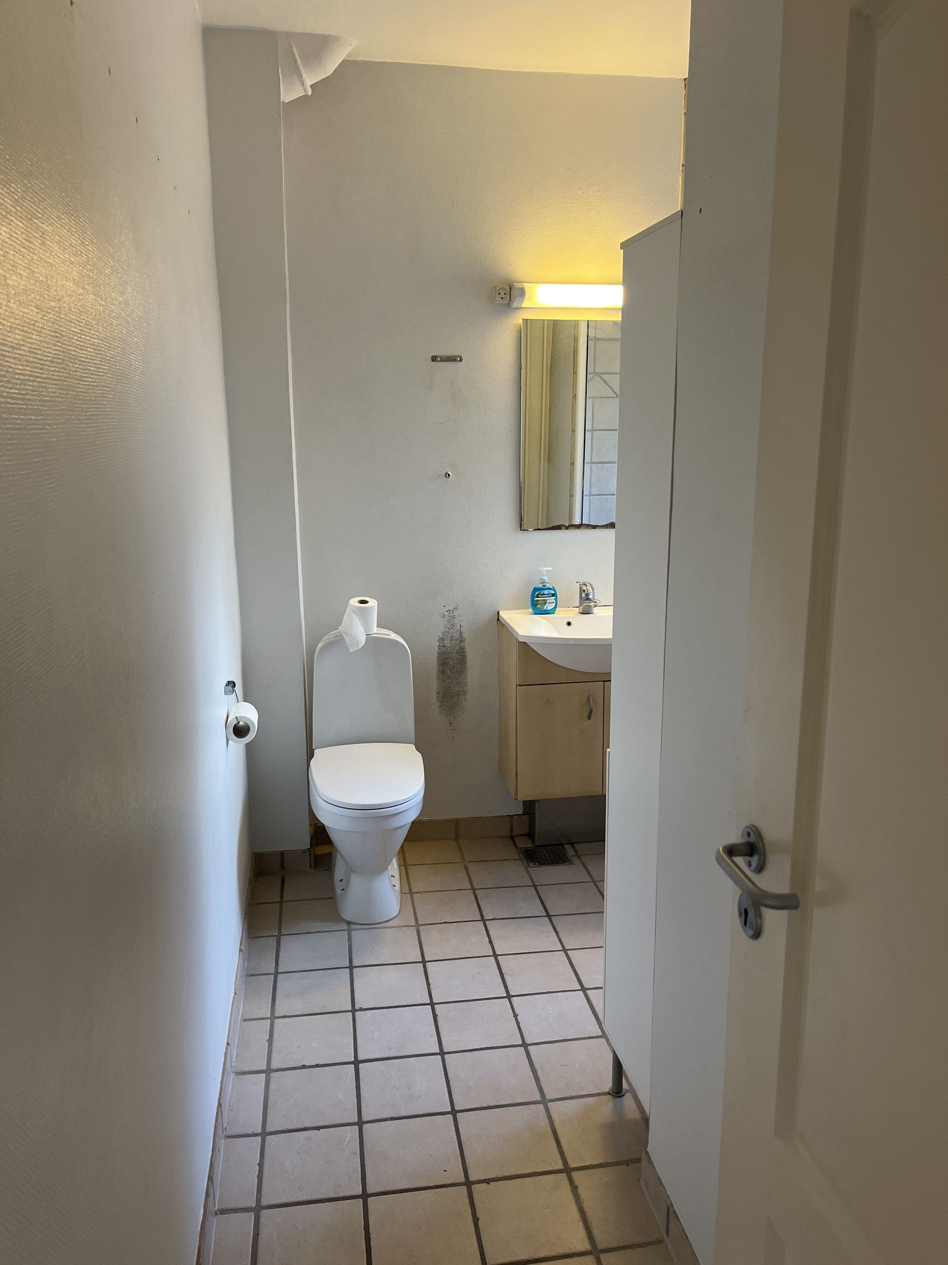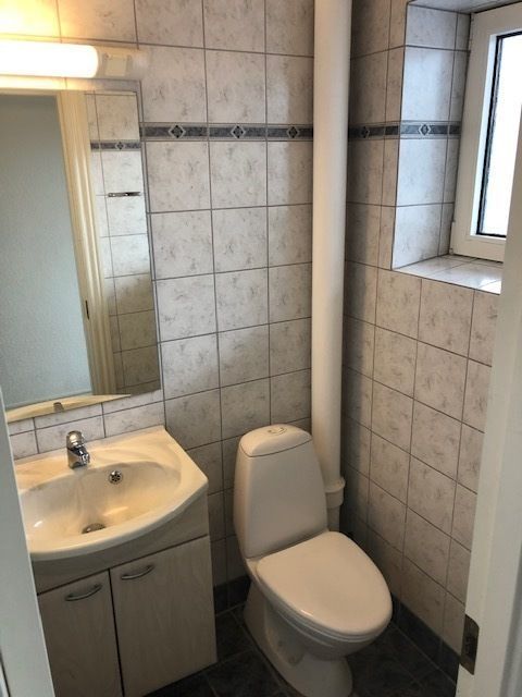 Badeværelset er lyst og enkelt med fliser, vindue og en praktisk, rummelig bruseniche.