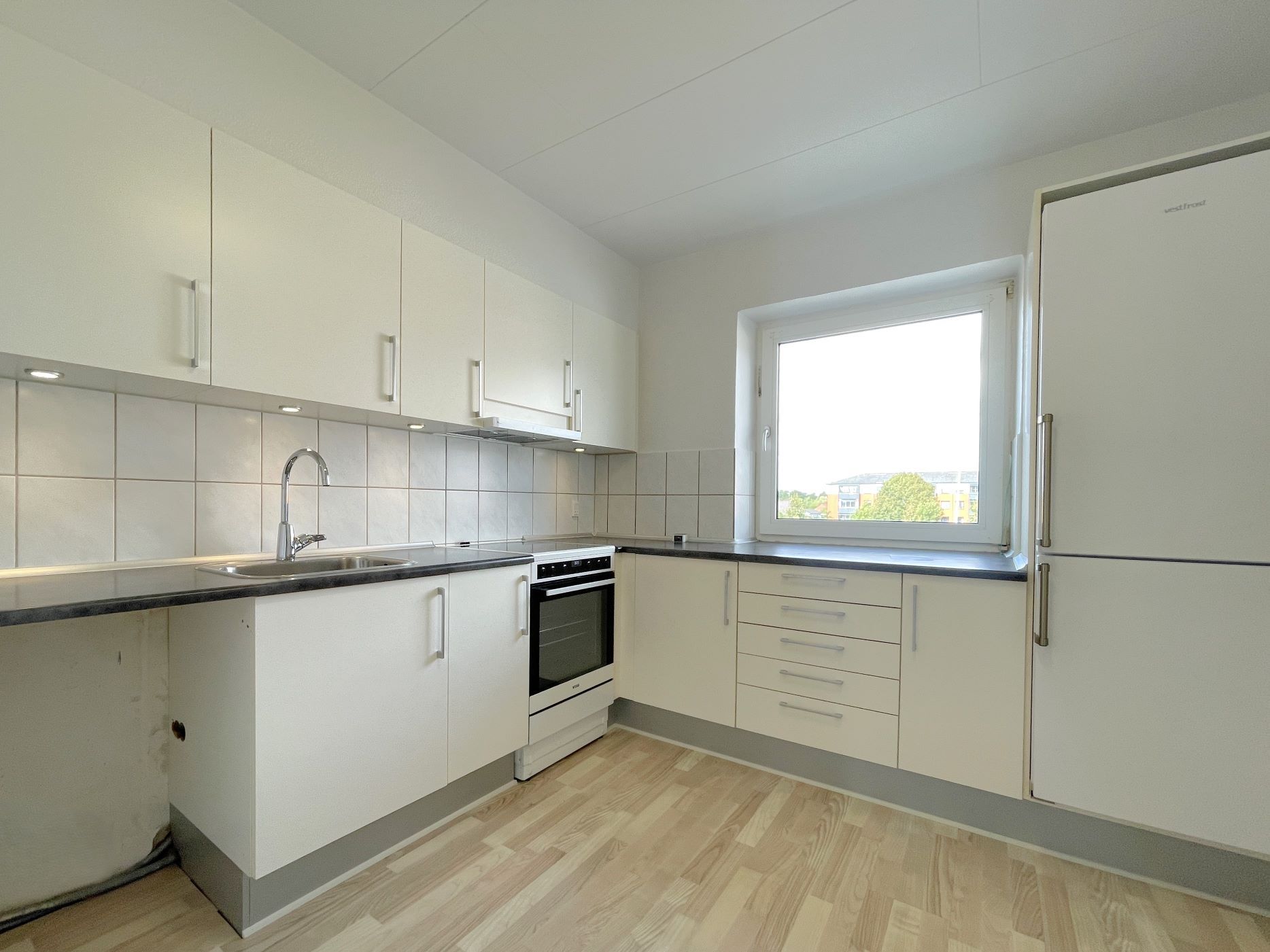 Nyrenoveret køkken, nyt køleskab,