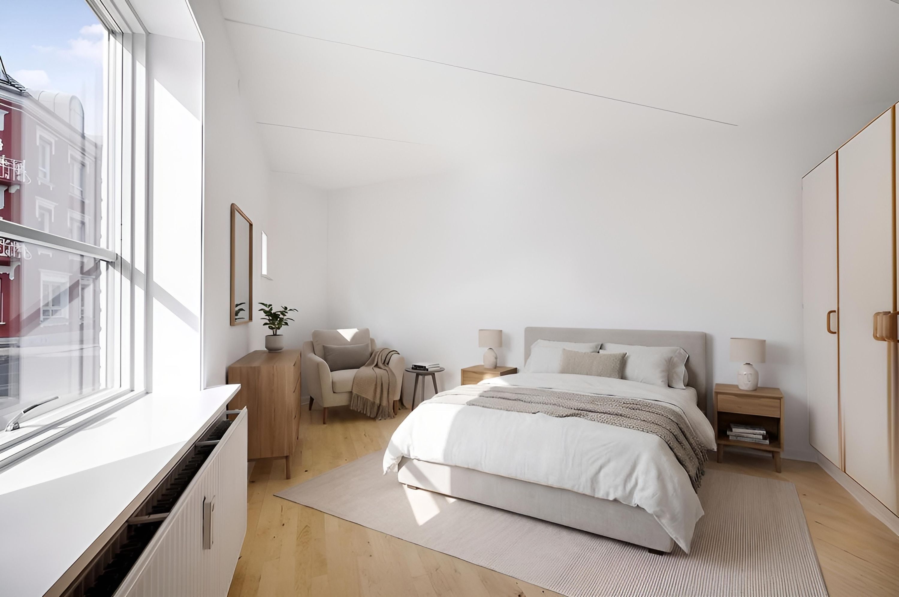 Fra stuen er der adgang til soveværelset, hvor der er skabe til opbevaring.