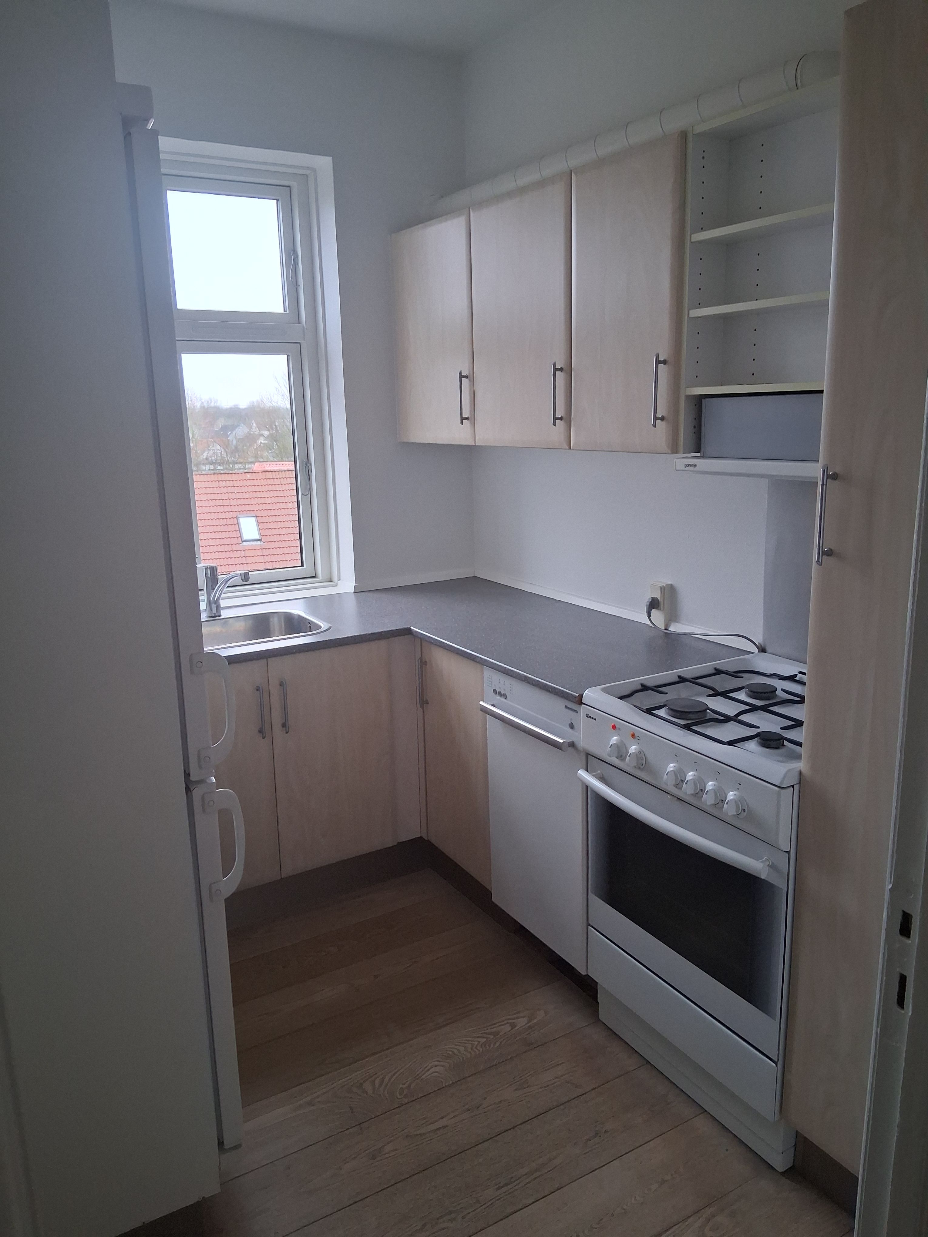 Funktionelt køkken med alt i hårde hvidevarer: Ovn, Mikrobølgeovn, Køl/frys, Emfang, opvaskemaskine, Induktionskogeplader.