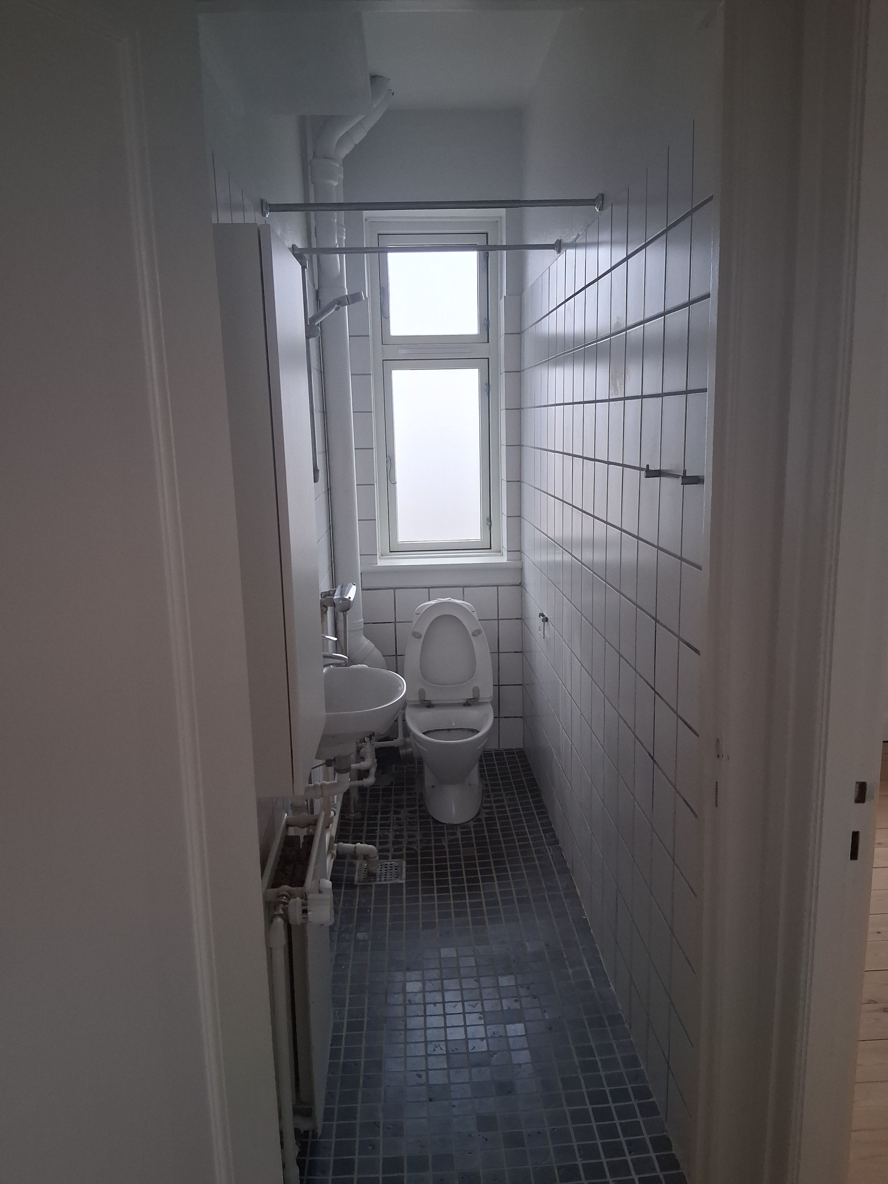 Stort brusebadeværelse med vaskemaskine, tørretumbler og HTH skabselementer.