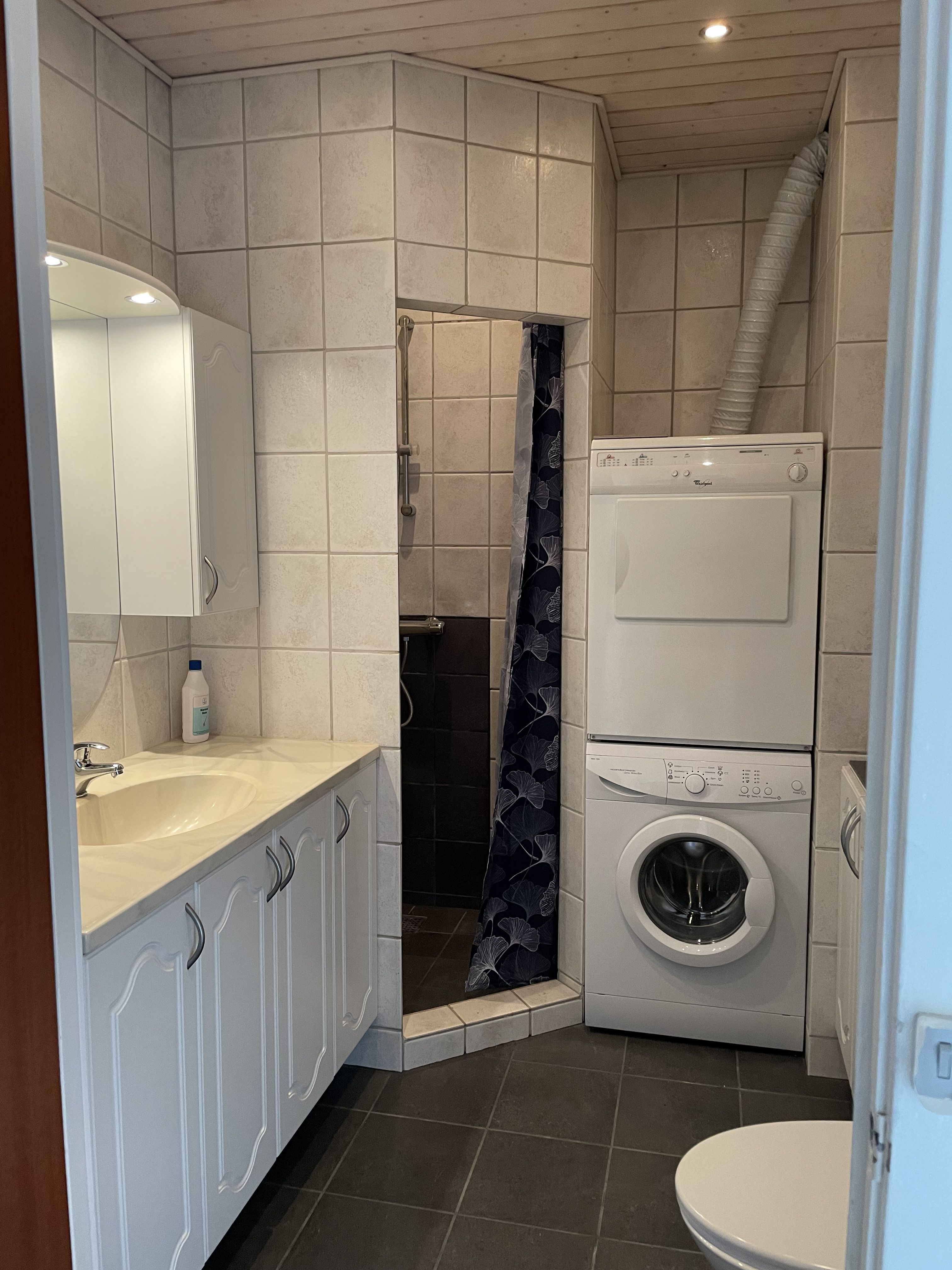 Badeværelset er lyst og stilrent, udstyret med en god bruseniche. Der er også en vaskemaskine og tørretumbler integreret i boligens entre.