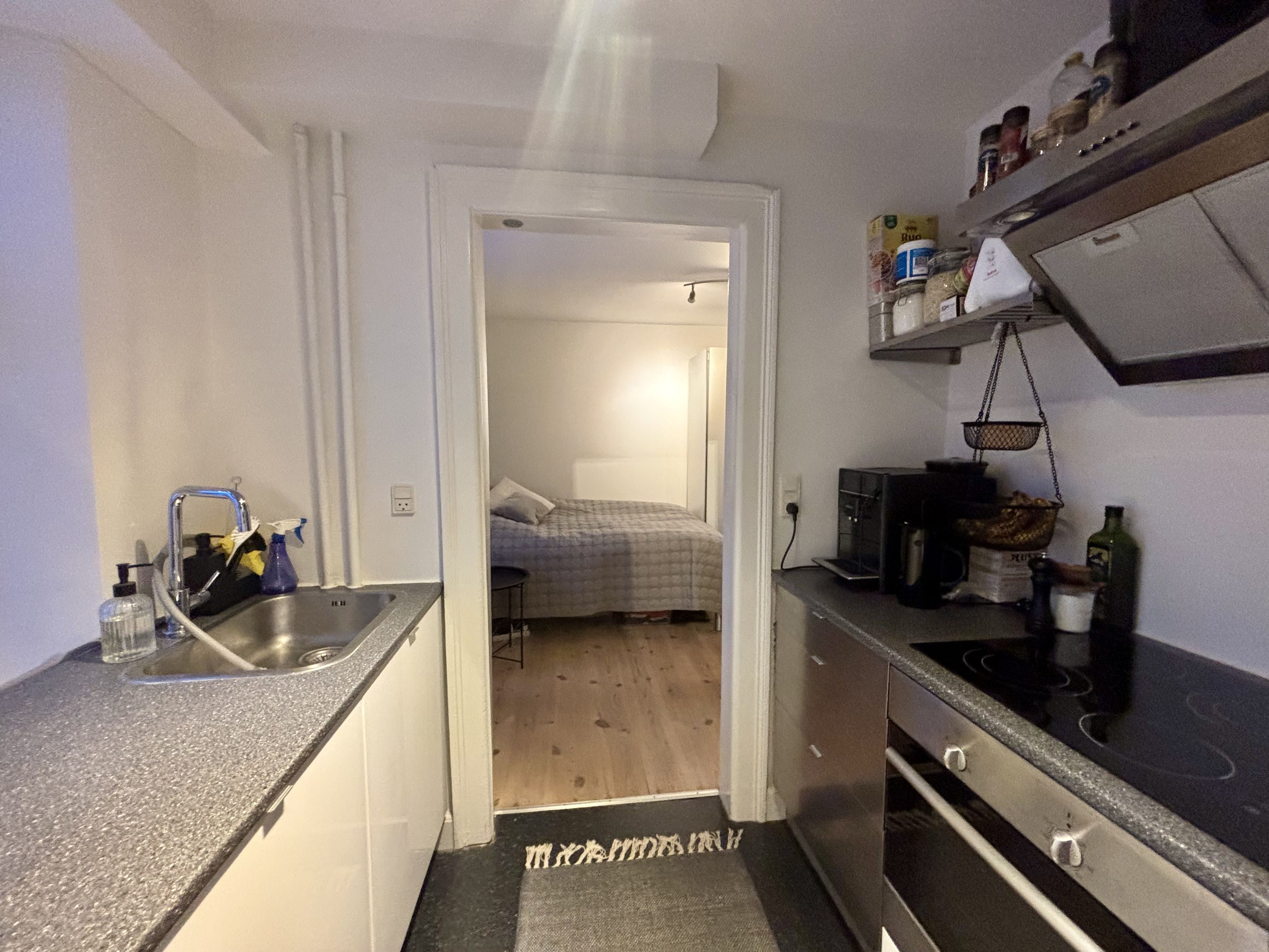 Lejlighedens indgang er en entré og herfra er der indgang til badeværelset, soveværelset, køkken og stuen.