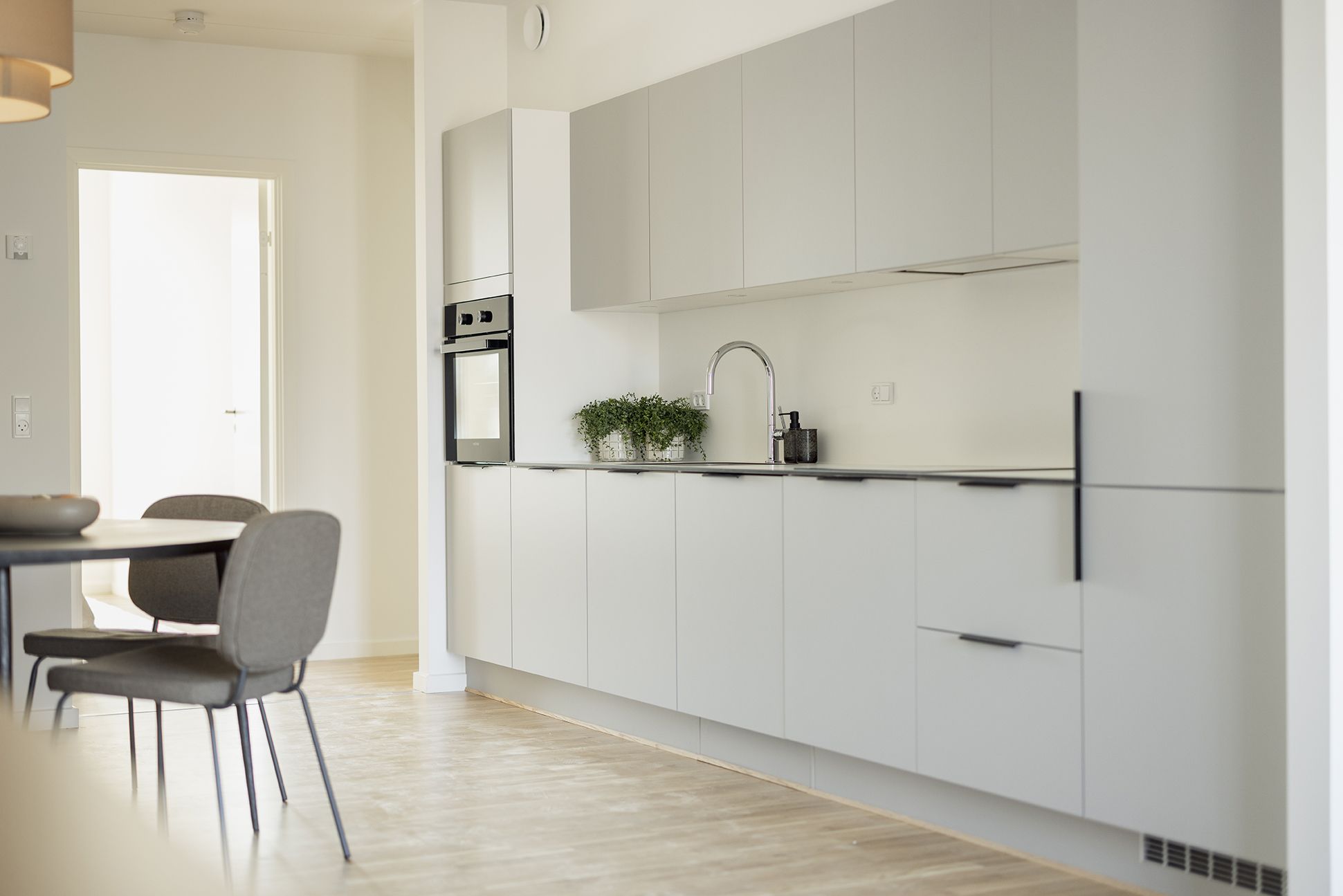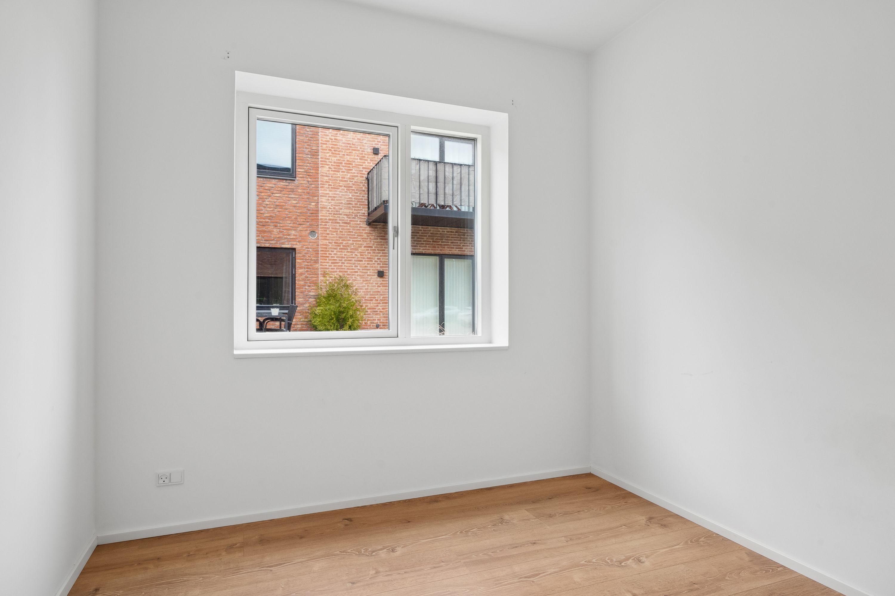 En dejlig lejlighed med stort lysindfald fra begge sider. Det store vinduesparti i køkkenalrummet indbyder til den smukke udsigt ud over rådhustorvet og byens tage. Samtidig byder både altan og soveværelse på udsigt helt til Nørreskoven.