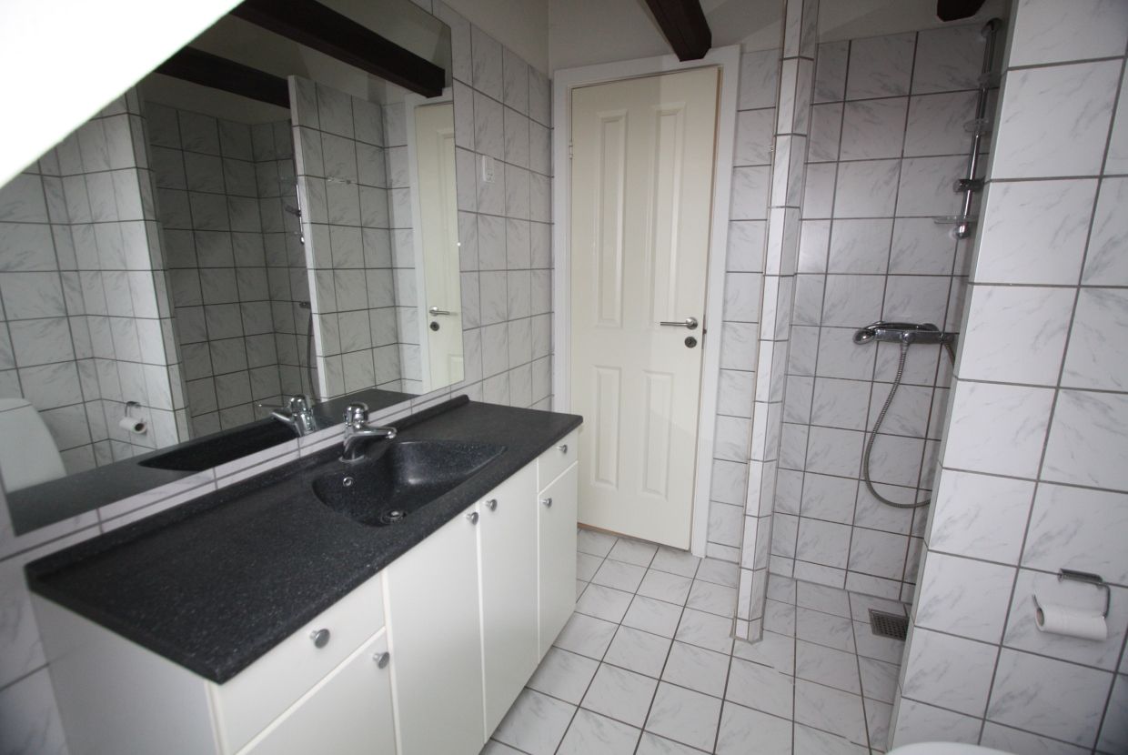 Badeværelset fremstår lyst og indbydende med moderne materialer og pladsbesparende løsninger - herunder mulighed for installation af vaskesøjle.