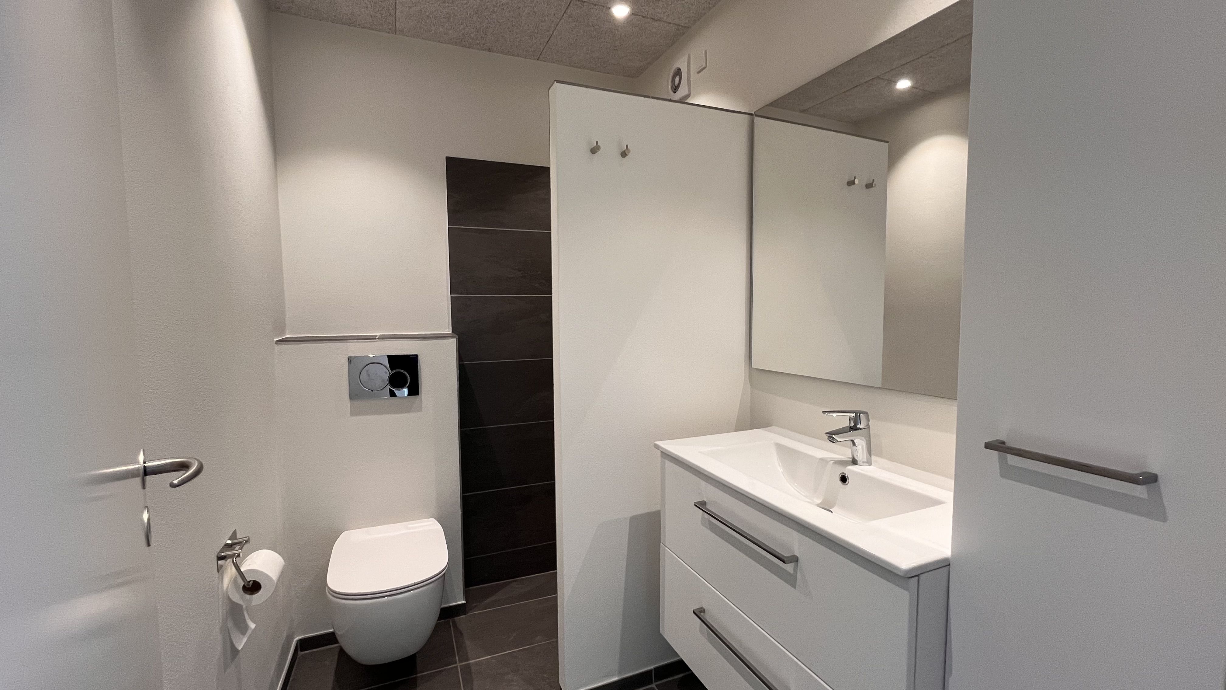 Soveværelset er mindre, men funktionelt indrettet med faste skabe og gulvtæppe. Badeværelset fremstår pænt og praktisk med bruseniche, skabe og mulighed for installation af egen vaskemaskine.