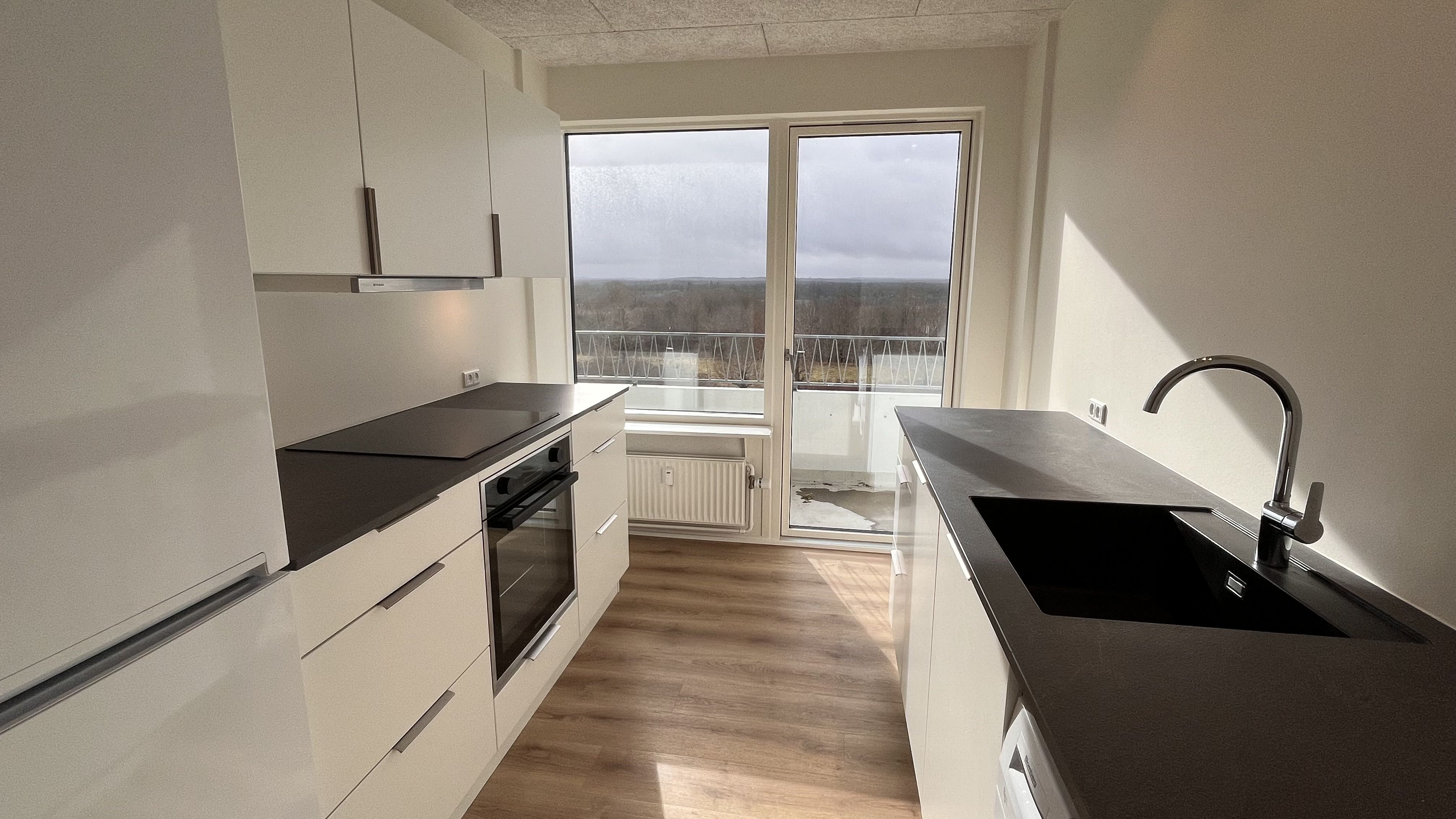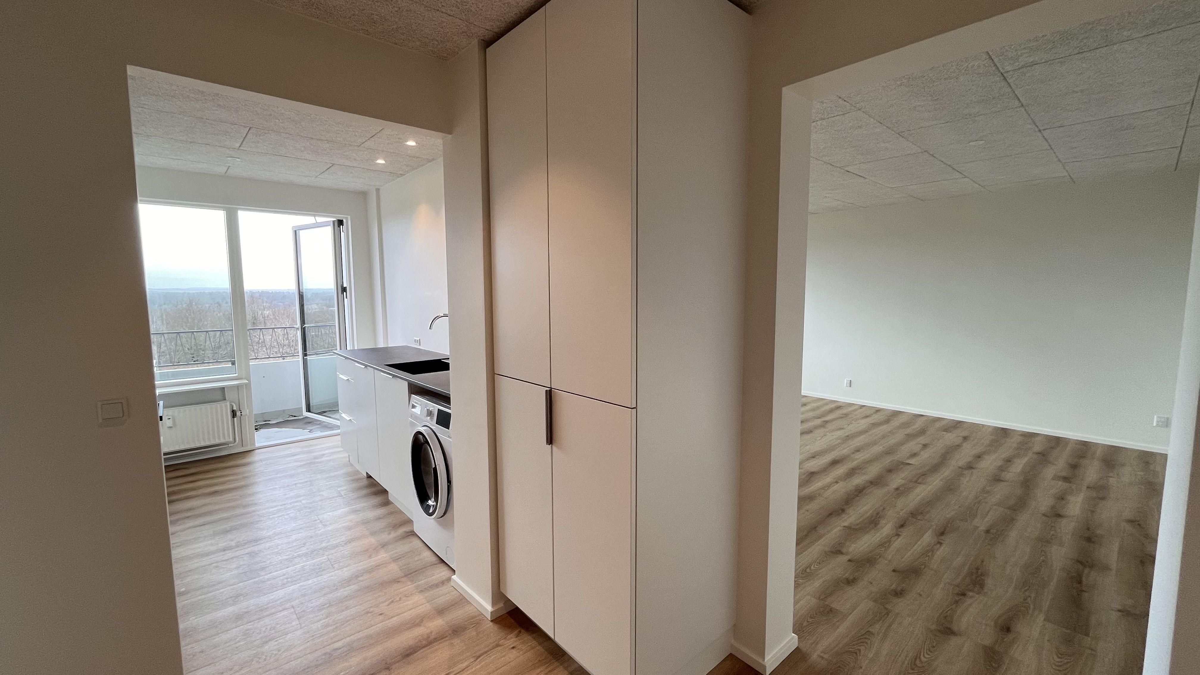 Lejligheden indeholder en lys stue i åben forbindelse med køkkenet, hvilket skaber et rummeligt og indbydende opholdsrum. Køkkenet er veludstyret med køle-/fryseskab, ovn, keramiske kogeplader, fritstående emhætte samt opvaskemaskine.