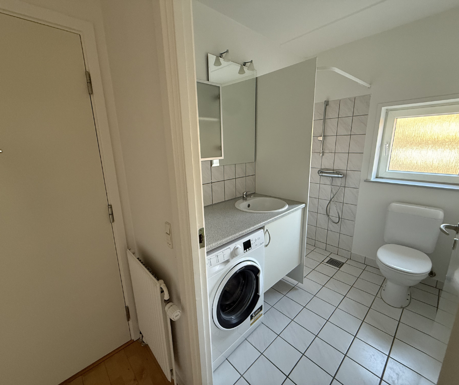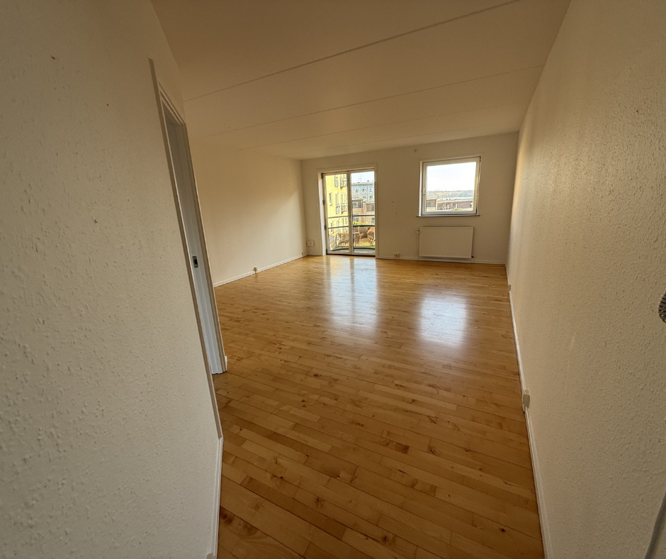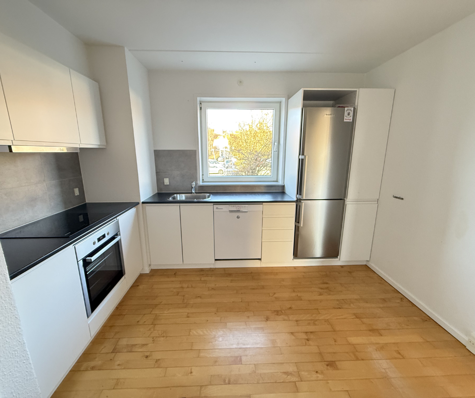 Lejligheden byder velkommen med et stort og sammenhængende køkken-alrum og stue, hvor både lys og luft får lov at spille hovedrollen. Det moderne køkken ligger praktisk langs væggen og giver en naturlig arbejdszone med god bordplads og integreret opvaskemaskine. I forlængelse heraf er der rigelig plads til både spisebord og sofa.