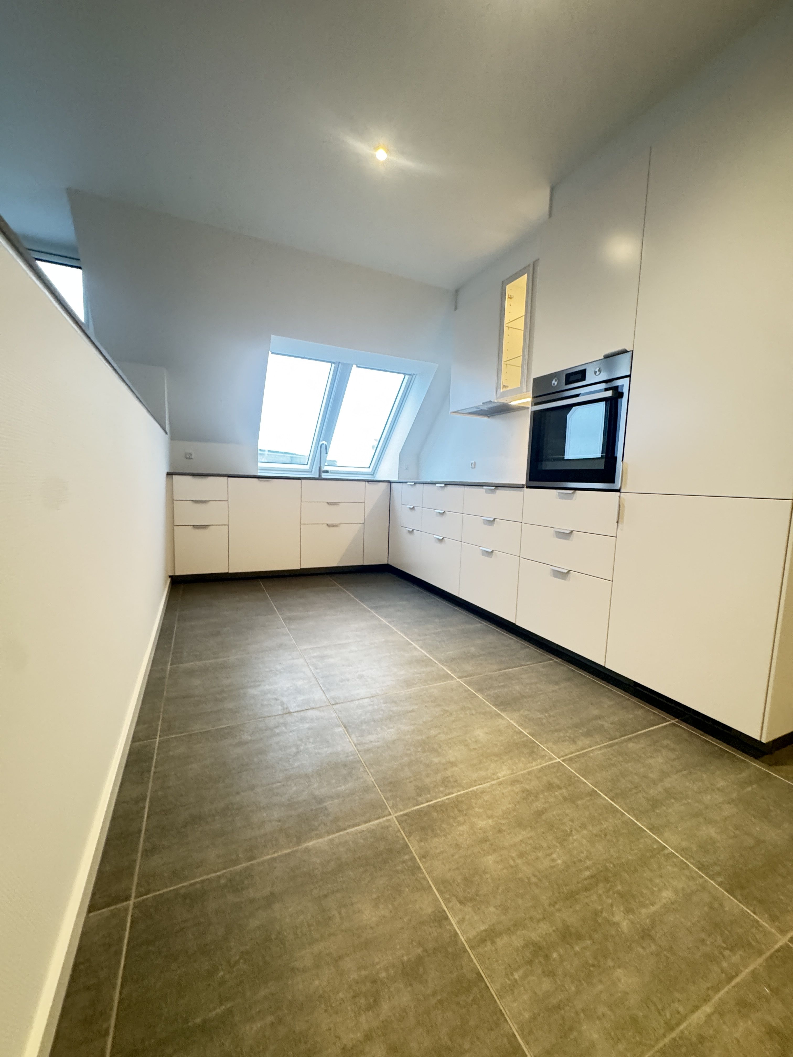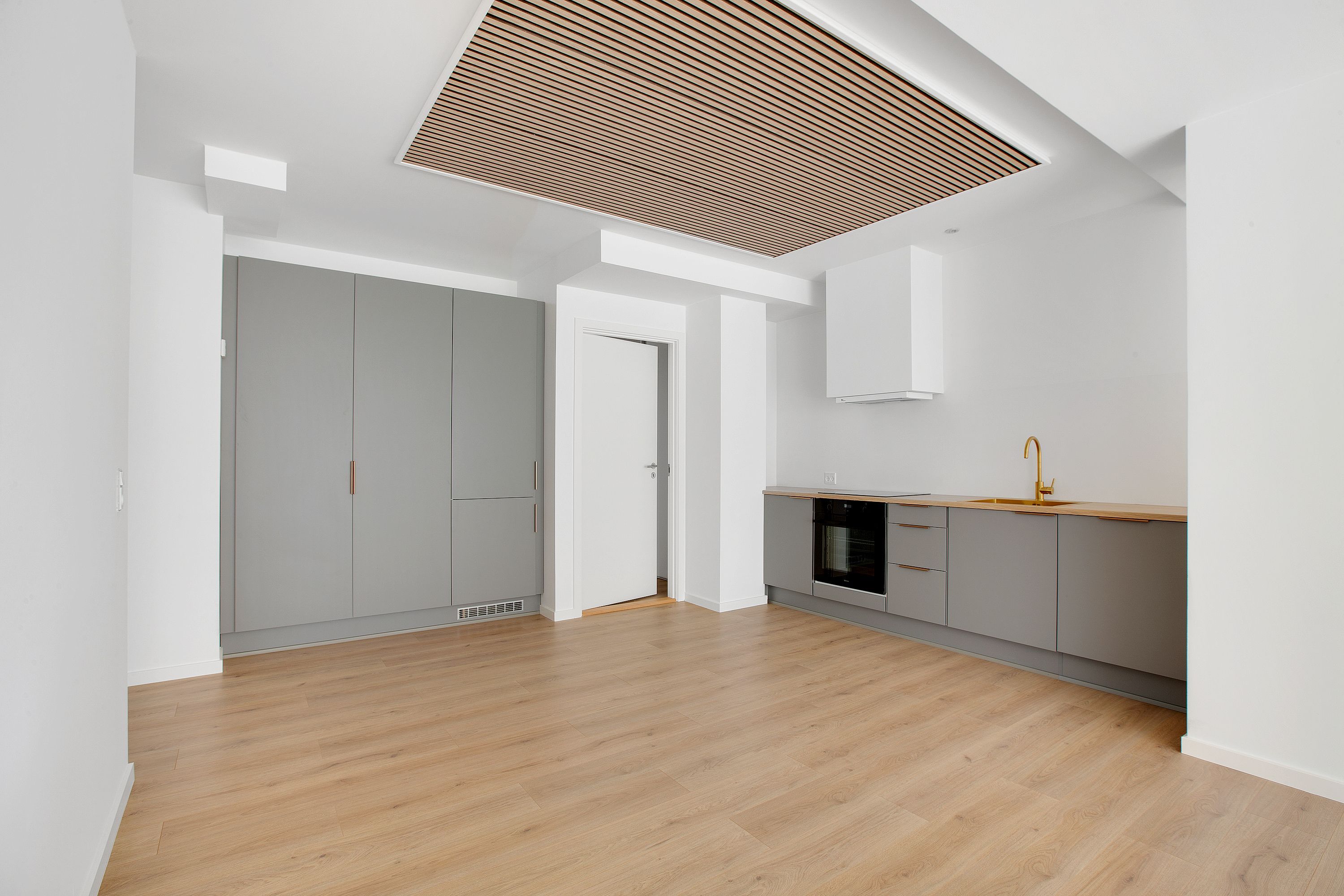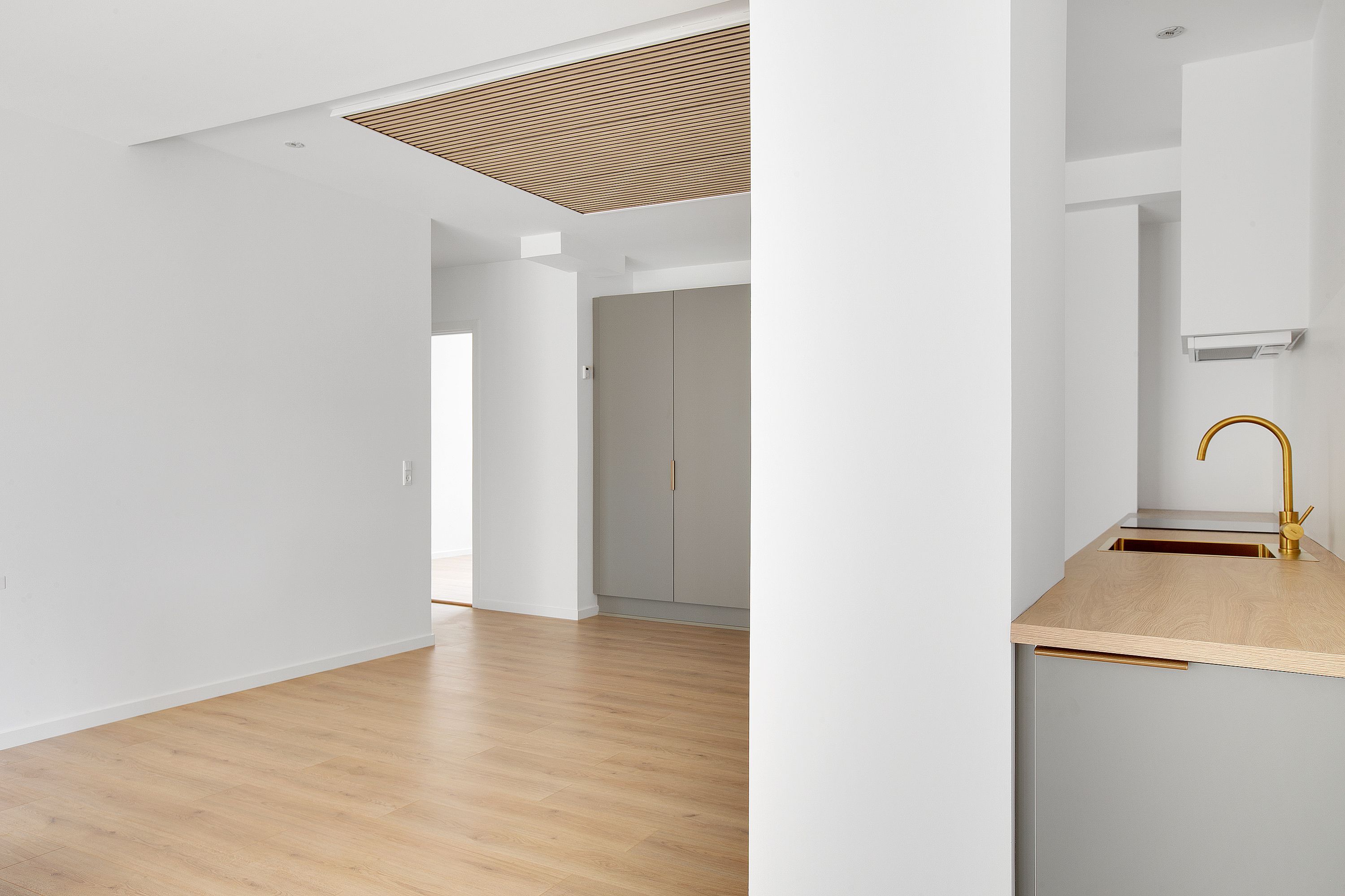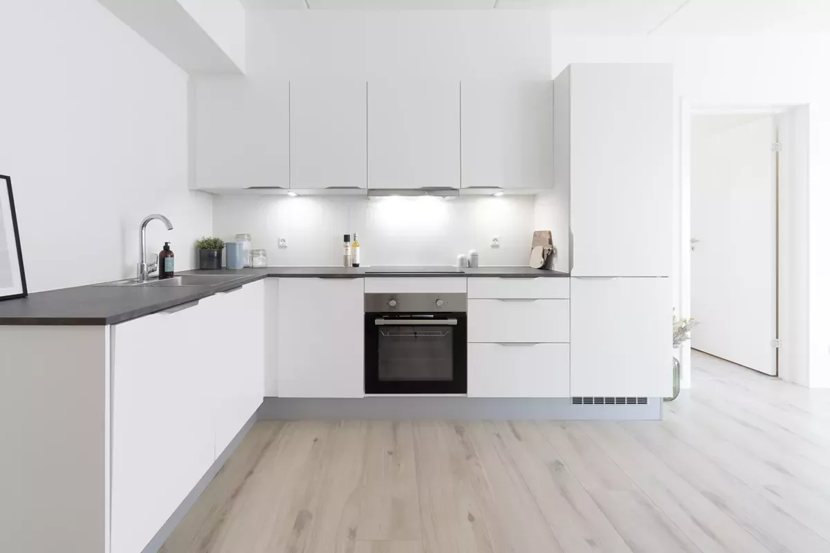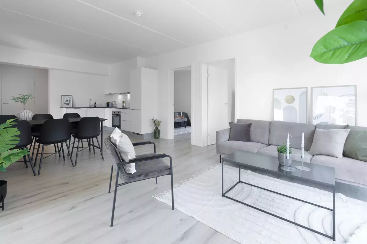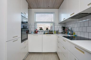 I stueplan finder du et lyst køkken med god plads og en rummelig stue med plads til både sofa og spisebord – ideel til hverdag og hyggelige aftener.