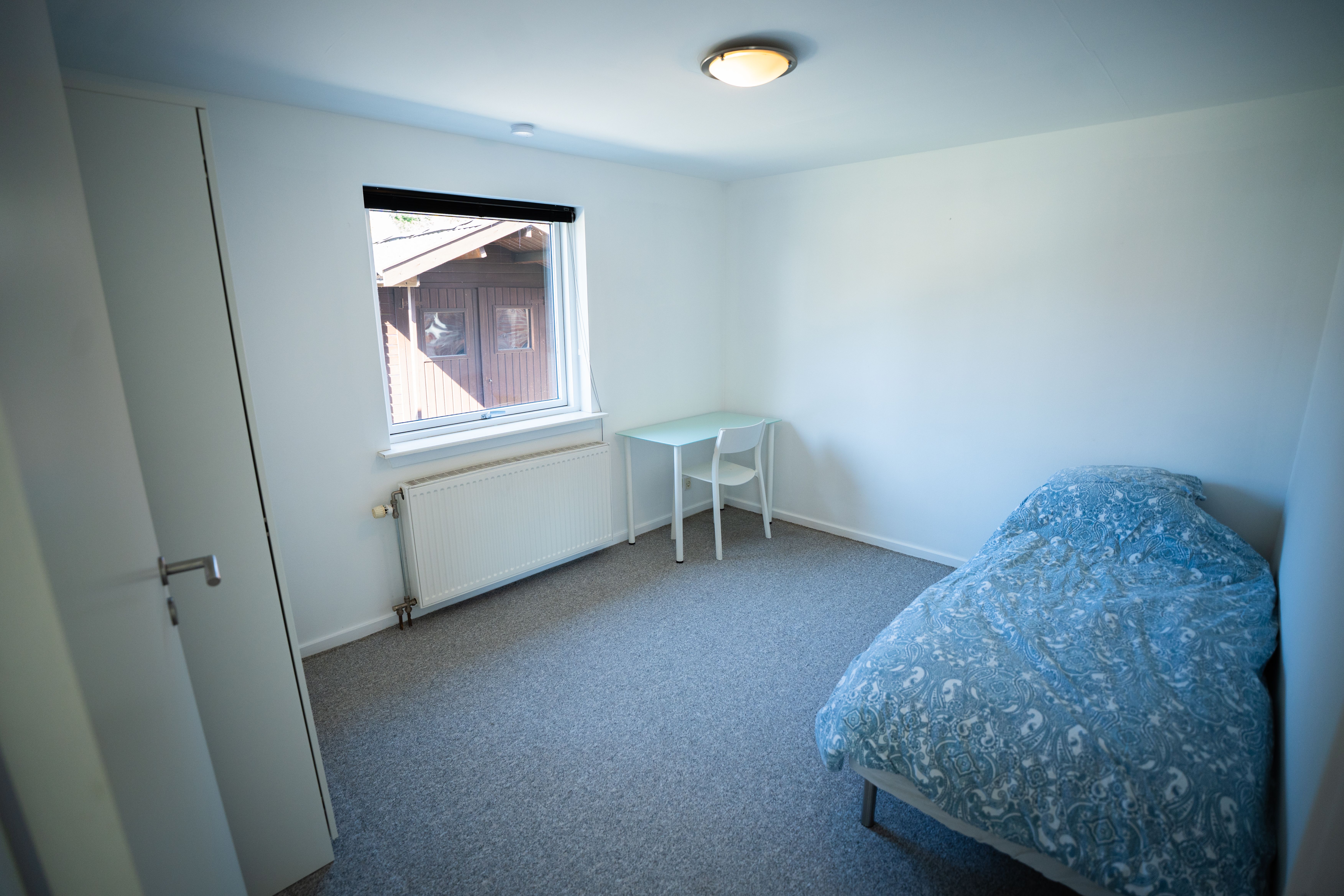 The room is fully furnished with bed and bedding, desk, chair, cupboard and storage space.