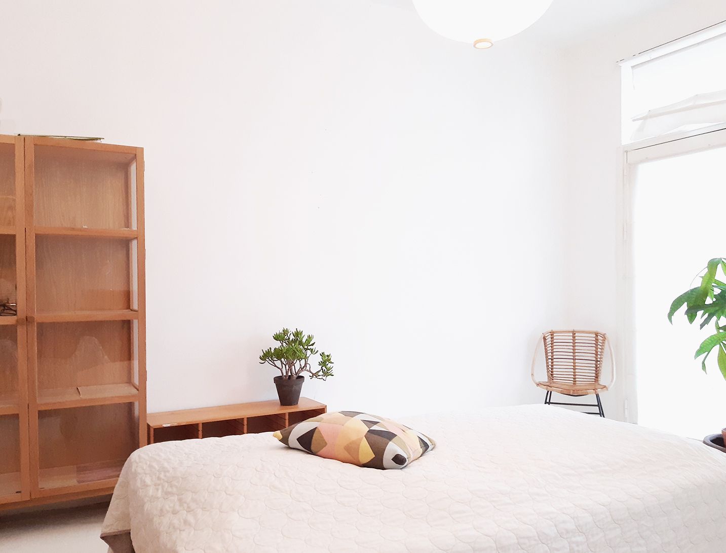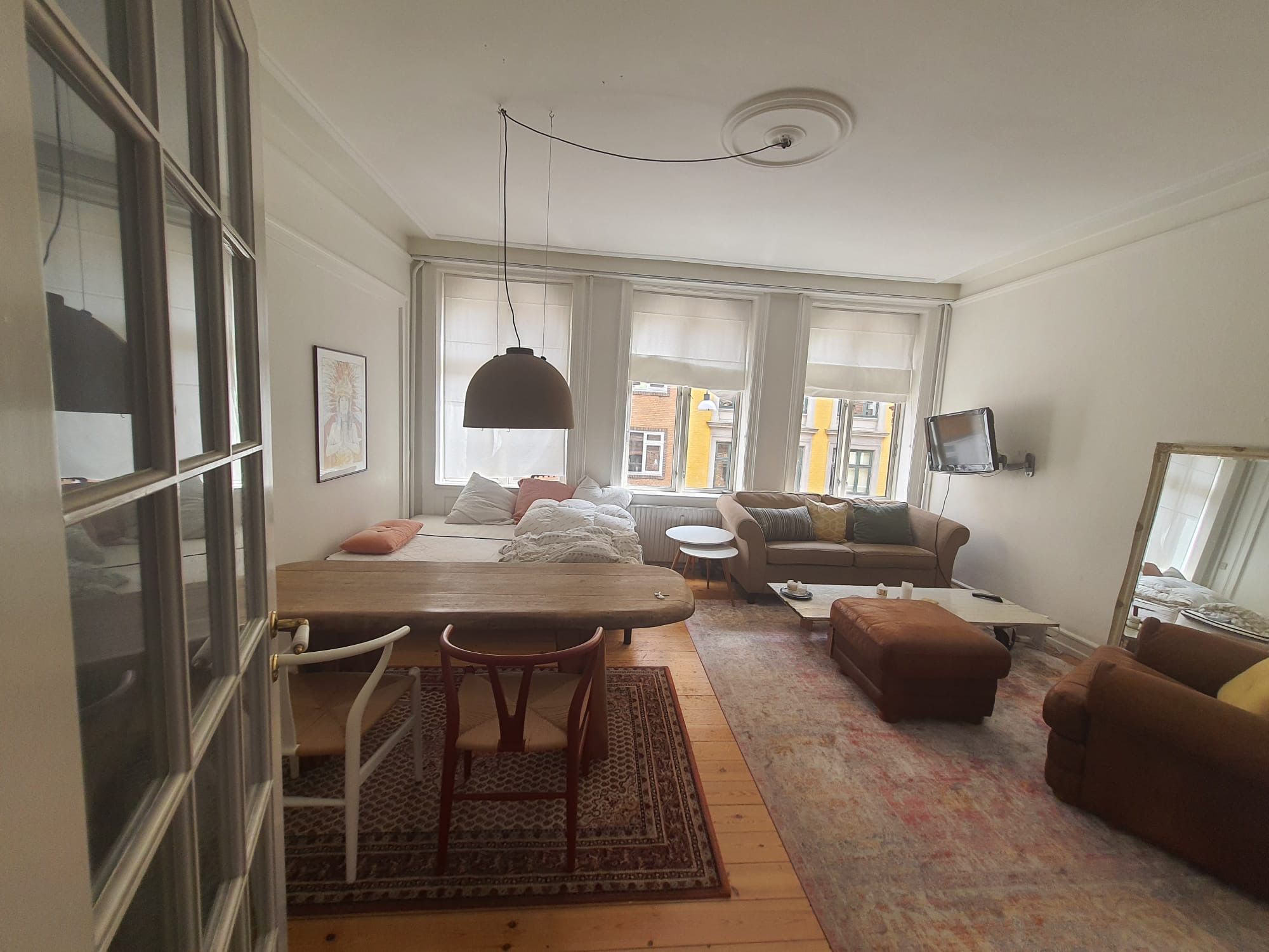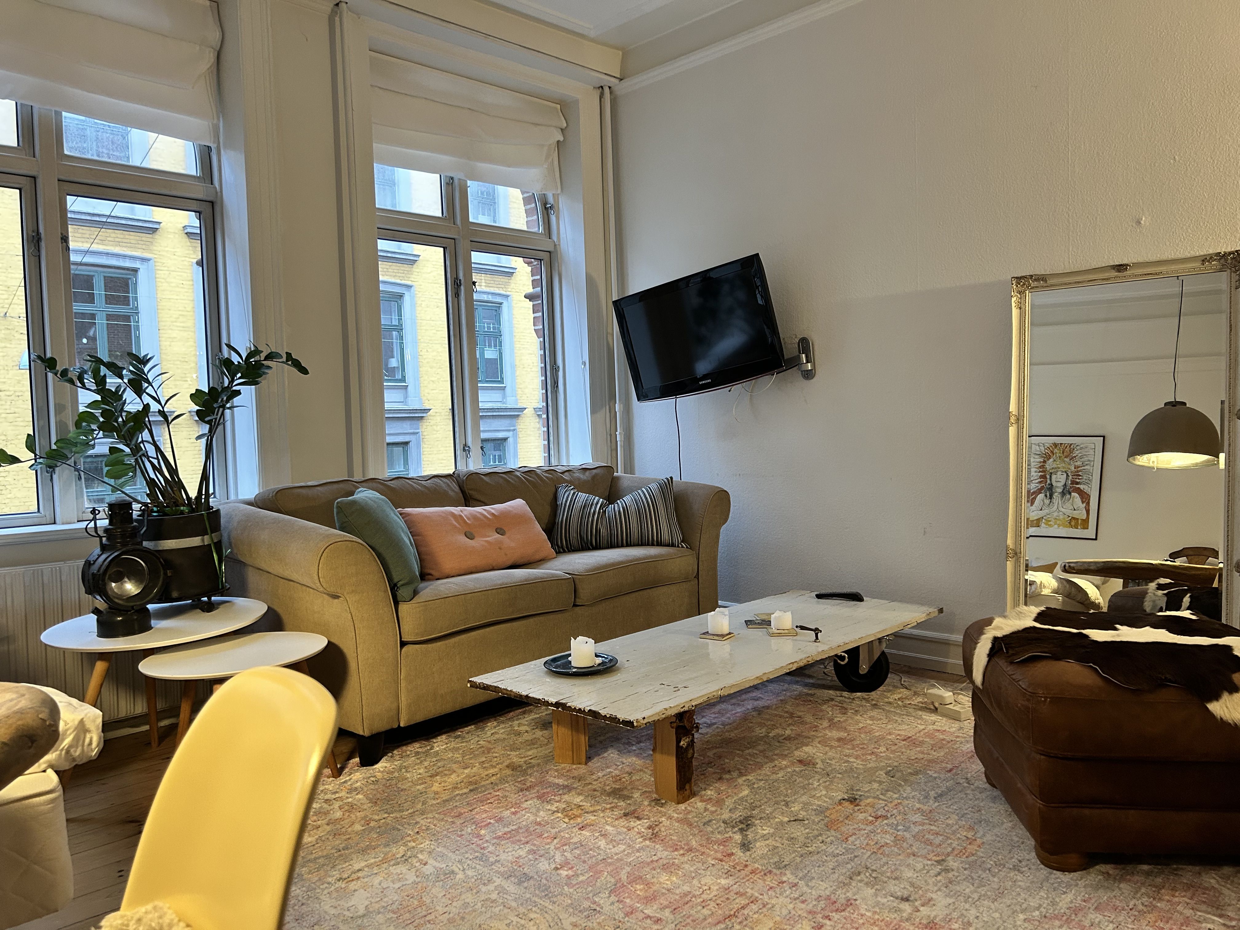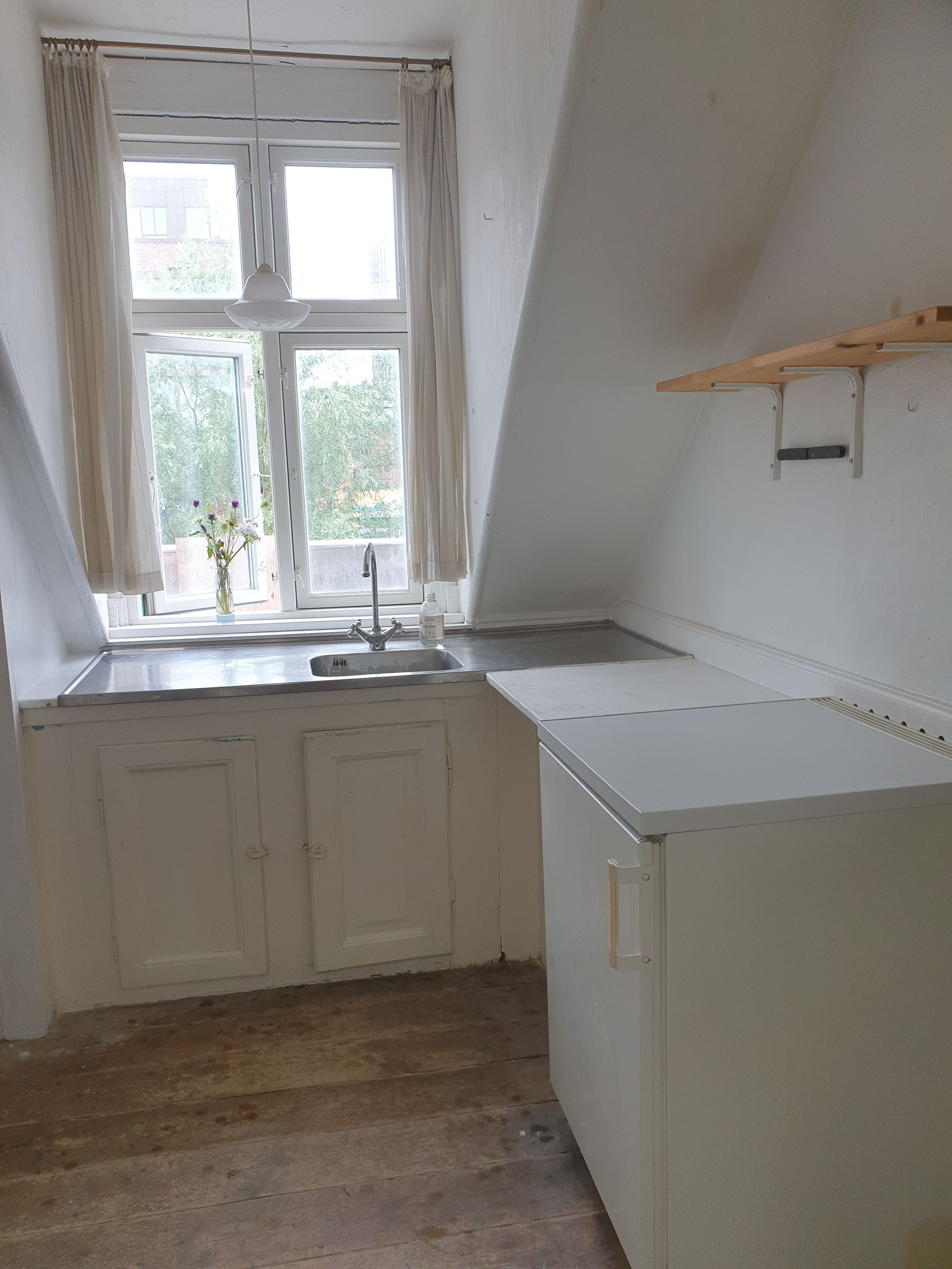 Værelset har udsigt til gårdhaven, højt til loftet, og masser af lys gennem det store, sydvendte indfaldsvindue. Jeg har hængt mørklægningsgardiner op, men værelset er derudover umøbleret.
