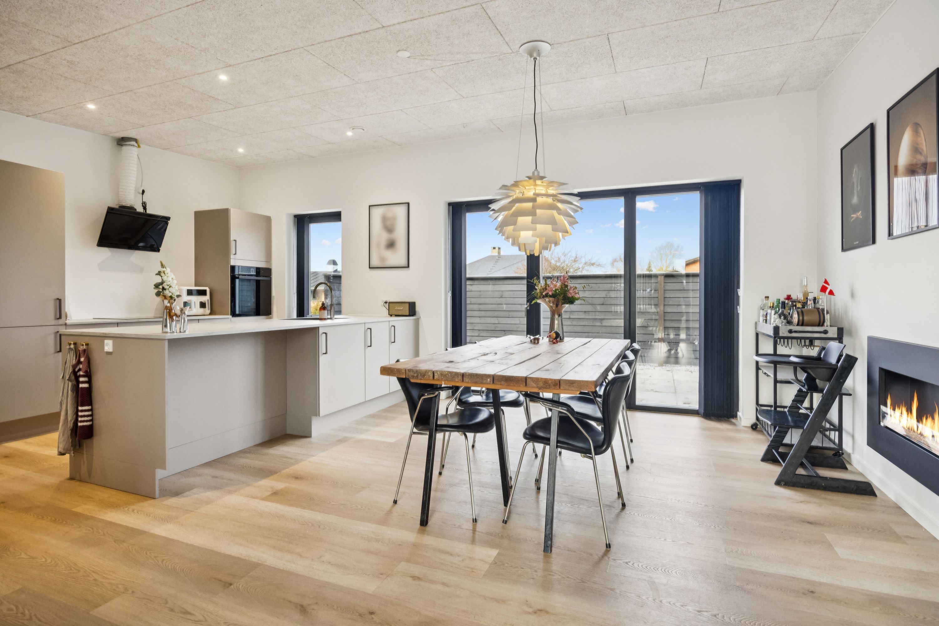 Lejligheden er indrettet med en flot lys entré. Herfra er der adgang til en skøn stue med vinduer fra gulv til loft med udgang til terrasse samt åben adgang til det flotte køkken, hvor der er plads til alt i hårde hvide varer.