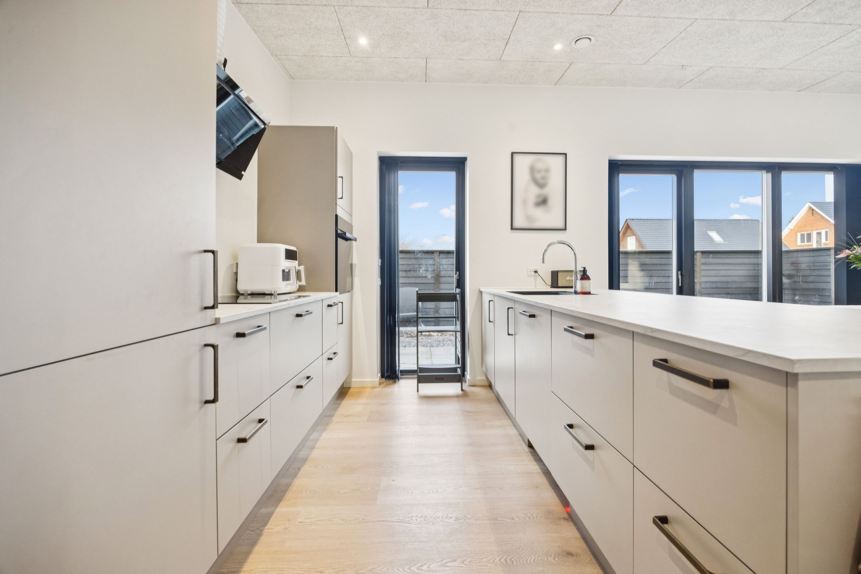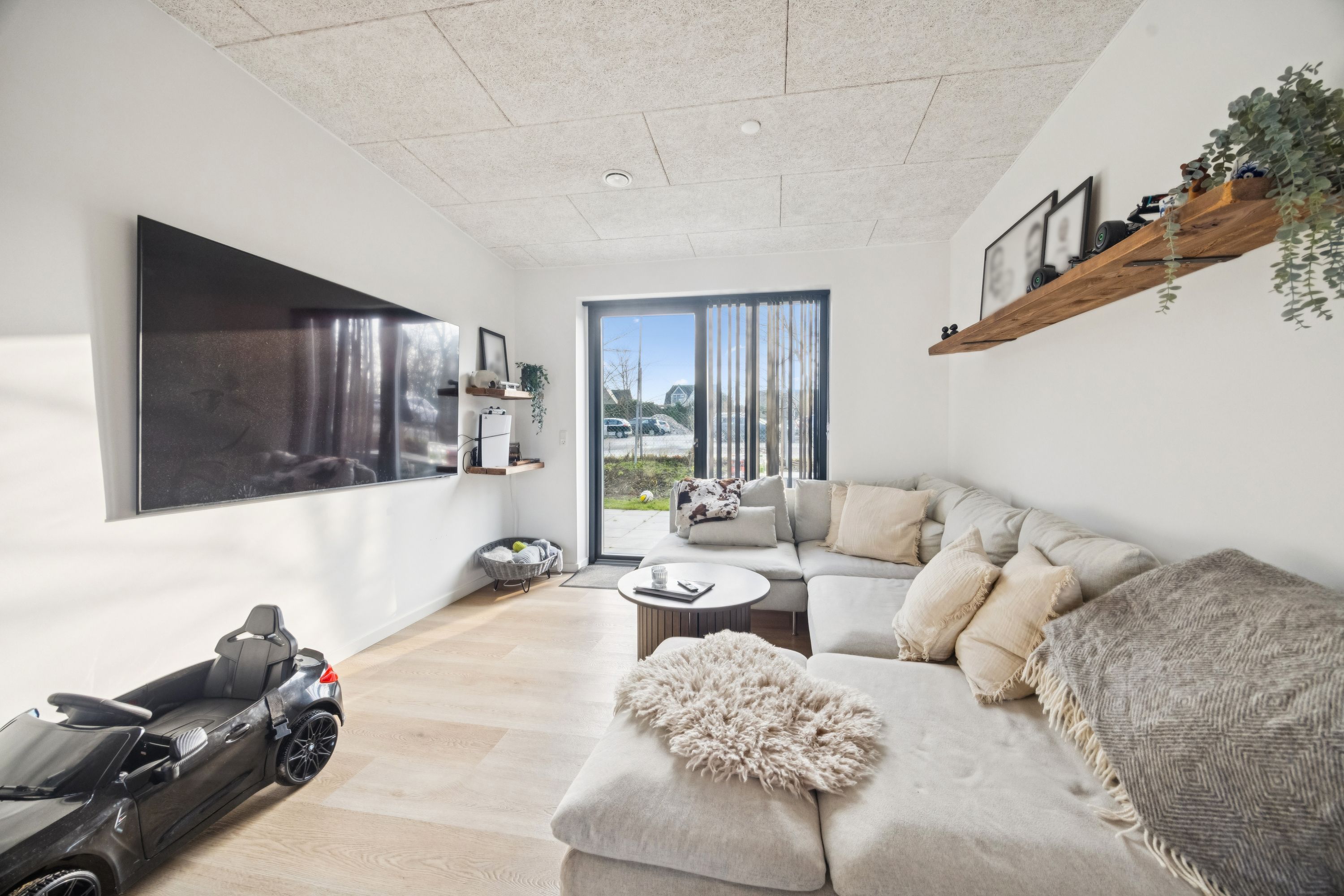 Her kan du leje et rigtig flot og moderne 1-plans rækkehus på lukket vej i Nørresundby og i sikre omgivelser, hvor børnene kan leje frit. Her er endda opsat en lejeplads.