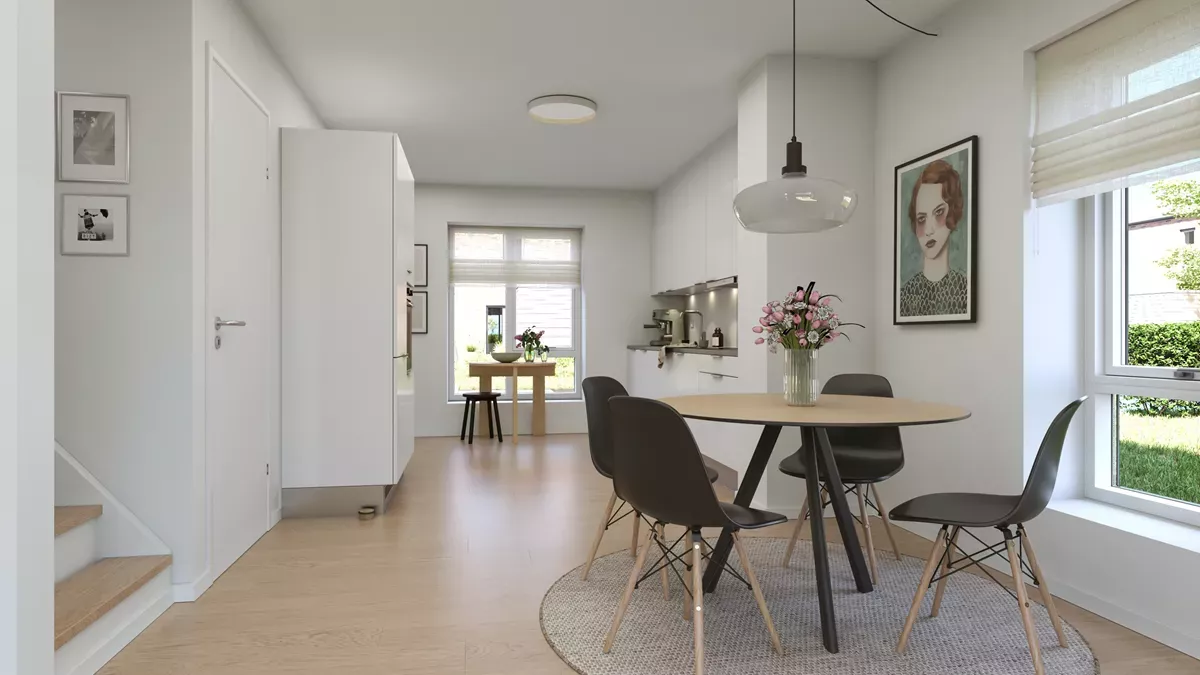 Boligen er lys og indretningsvenlig og indeholder åbent køkken i forbindelse med stuen. Køkkenet er indrettet med lyse elementer og grålig bordplade, og der er mulighed for installation af opvaskemaskine. Stuen har stort vinduesparti, som giver et skønt lysindfald i boligen.