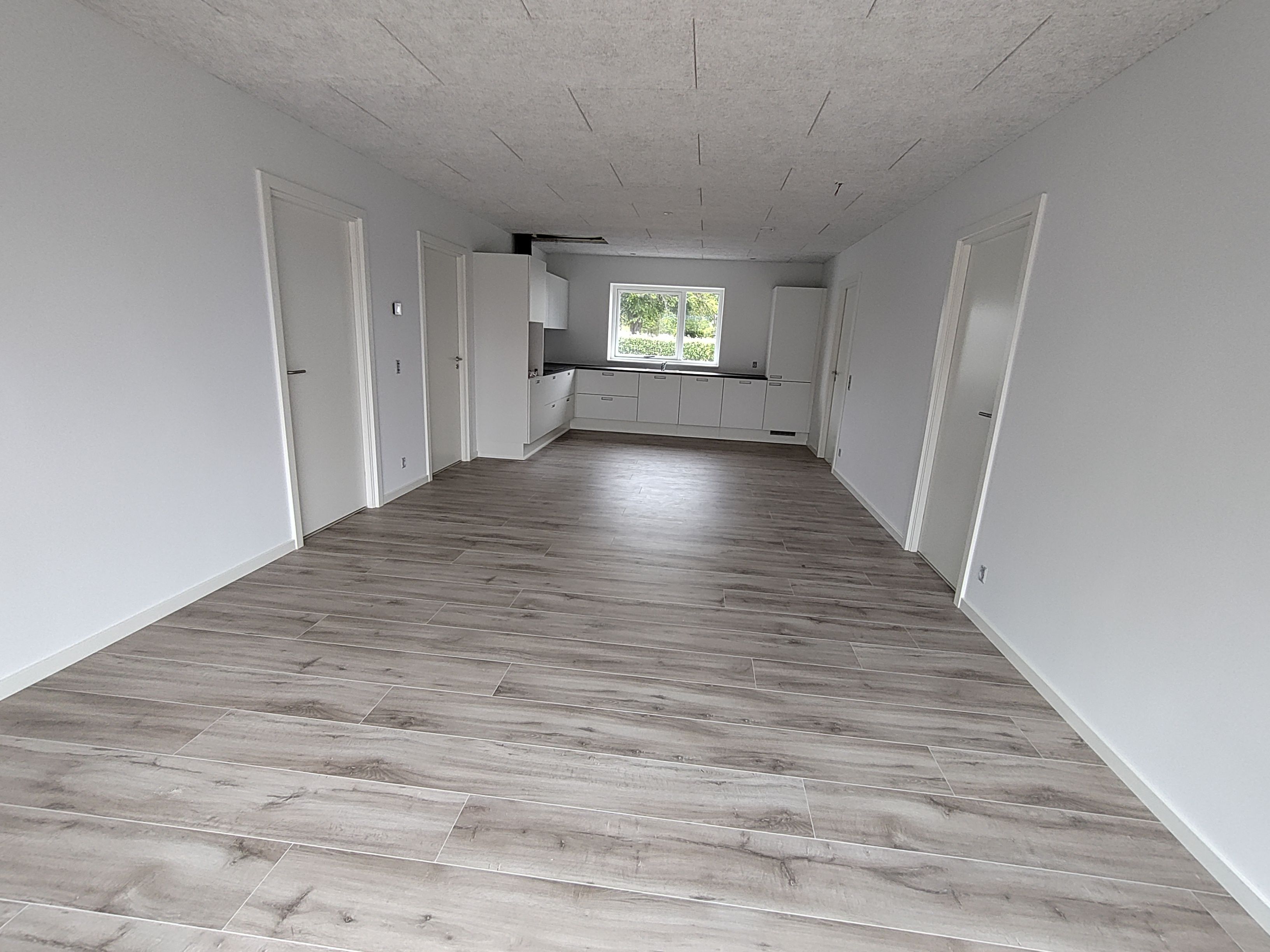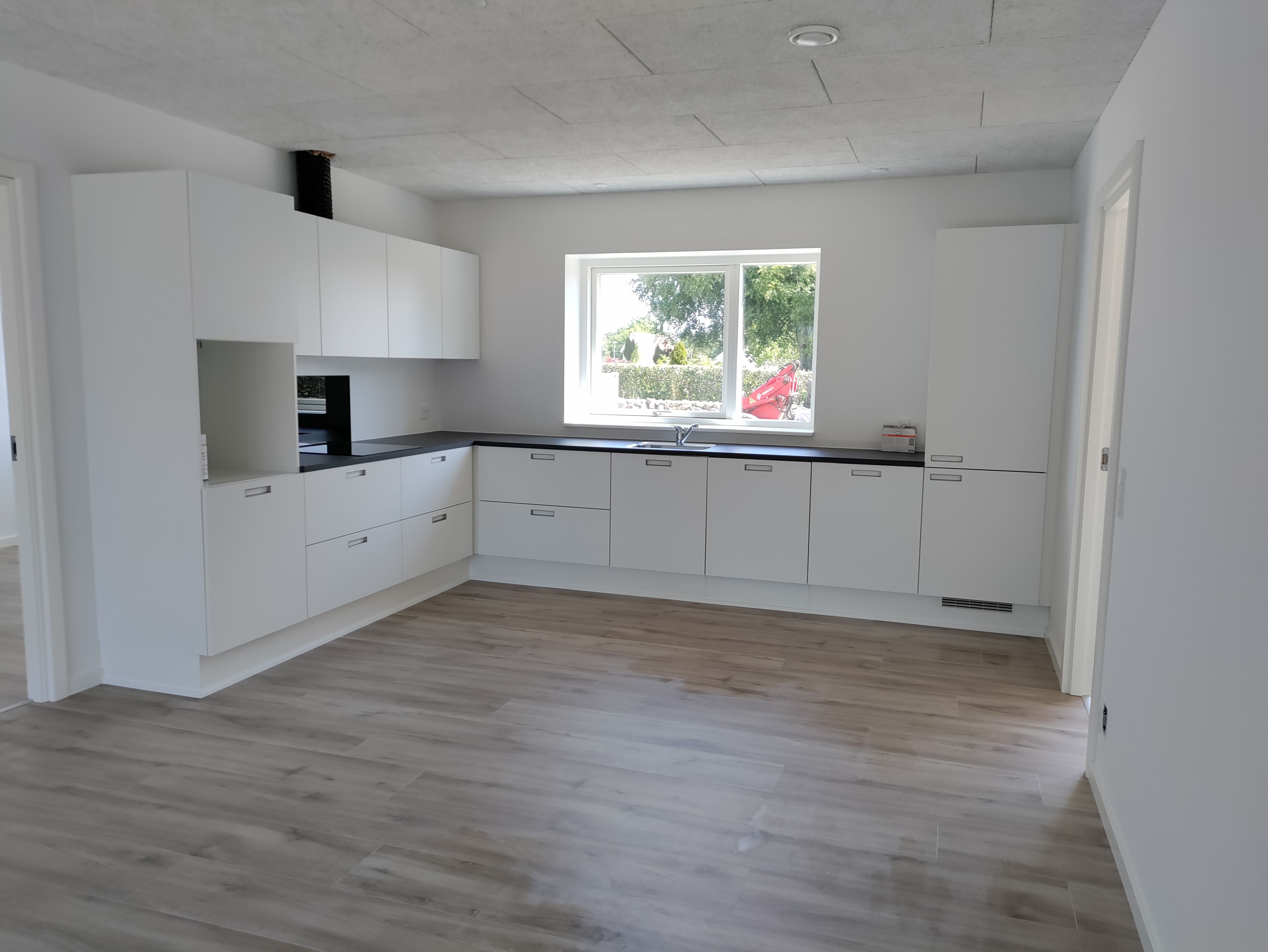 Køle/fryseskab, opvaskemaskine, emhætte, ovn, induktionskogeplade, vaskemaskine og tørretumbler – alt sammen nyt og klar til brug.