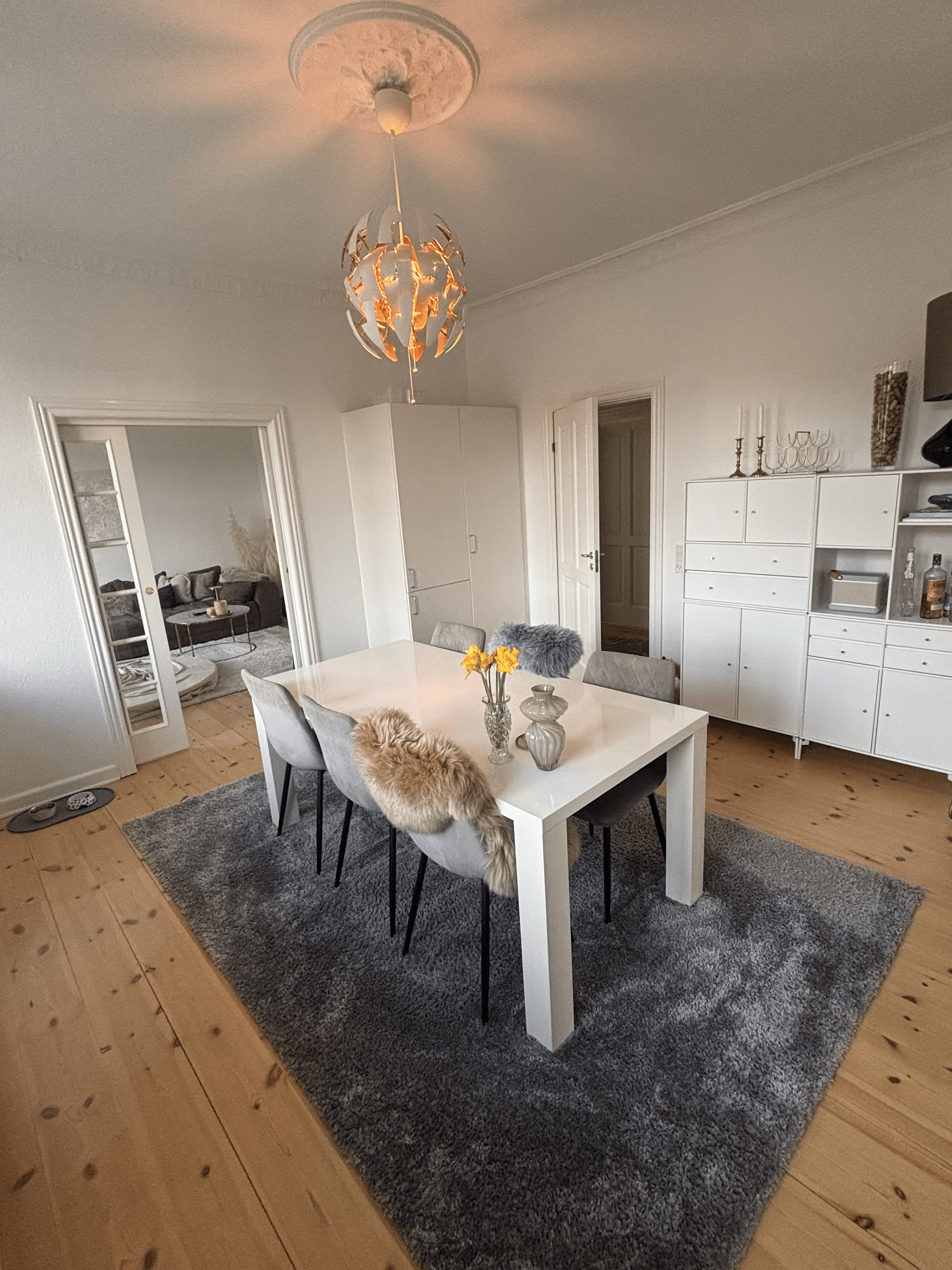 Boligen har et åbent og funktionelt køkken-alrum, hvor køkkenøen giver ekstra bordplads og skaber en naturlig sammenhæng til opholdsrummet. Det moderne HTH-køkken har integrerede hvidevarer og giver gode rammer for madlavning og hverdag. Indretningen giver god plads til både spisebord og sofaområde, og fra stuen er der direkte adgang til terrassen.