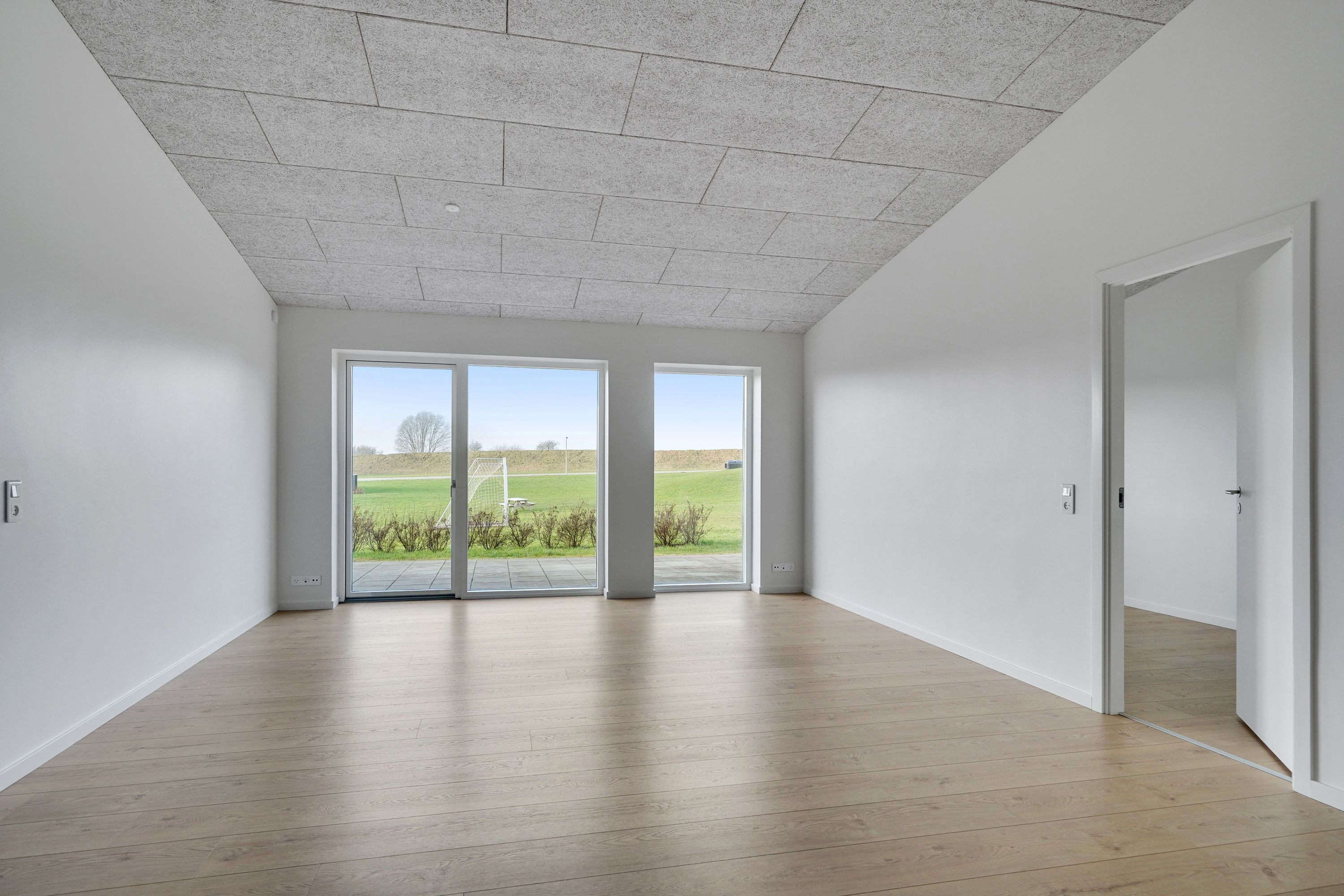 Stort opholdsrum med troldtek loft og åben til kip
