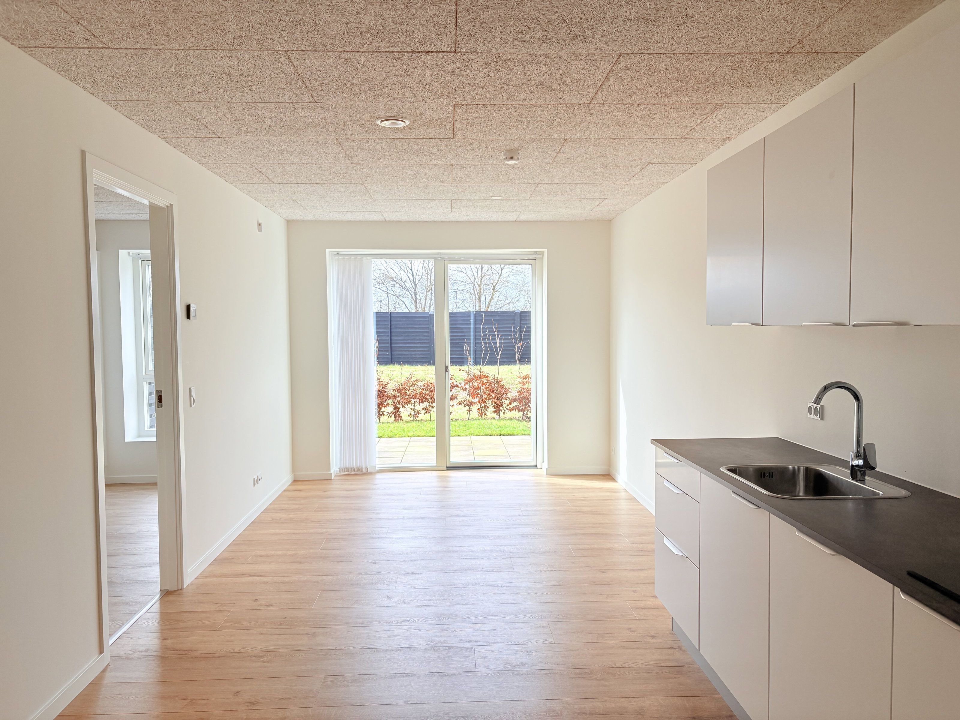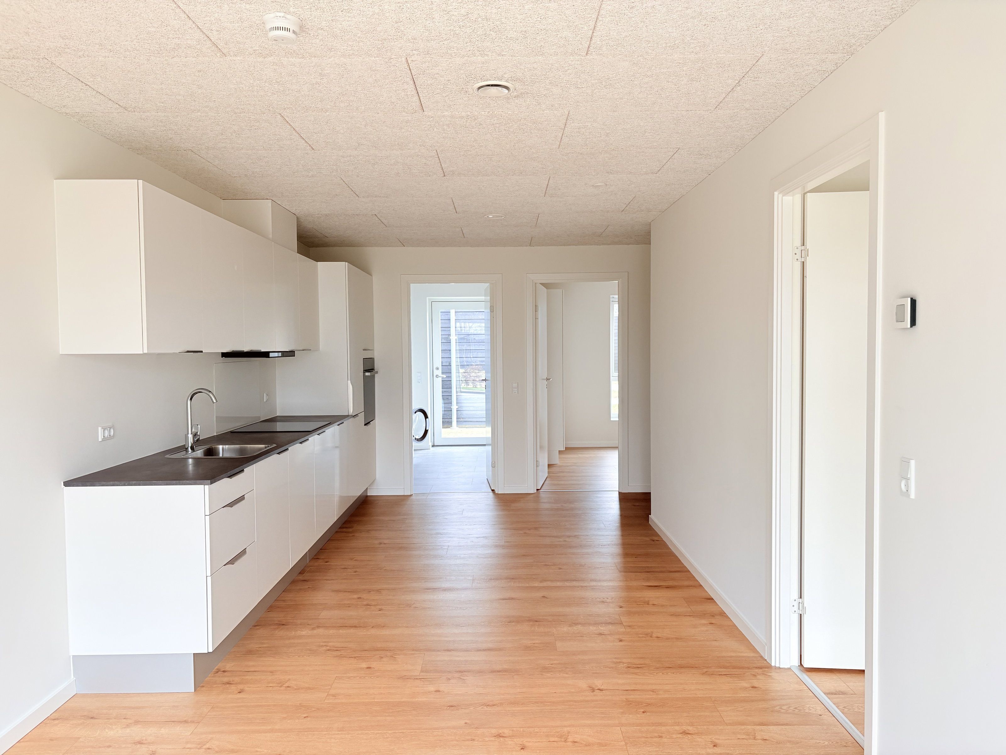 Boligens naturlige samlingspunkt er det åbne køkken-alrum, hvor madlavning, hygge og hverdag smelter sammen. Køkkenet er udstyret med tidløse materialer og alle nødvendige hårde hvidevarer, og den gode rummelighed giver plads til både spisebord og dagligstue. De store vinduespartier sørger for et behageligt lysindfald gennem hele dagen og skaber en indbydende atmosfære.