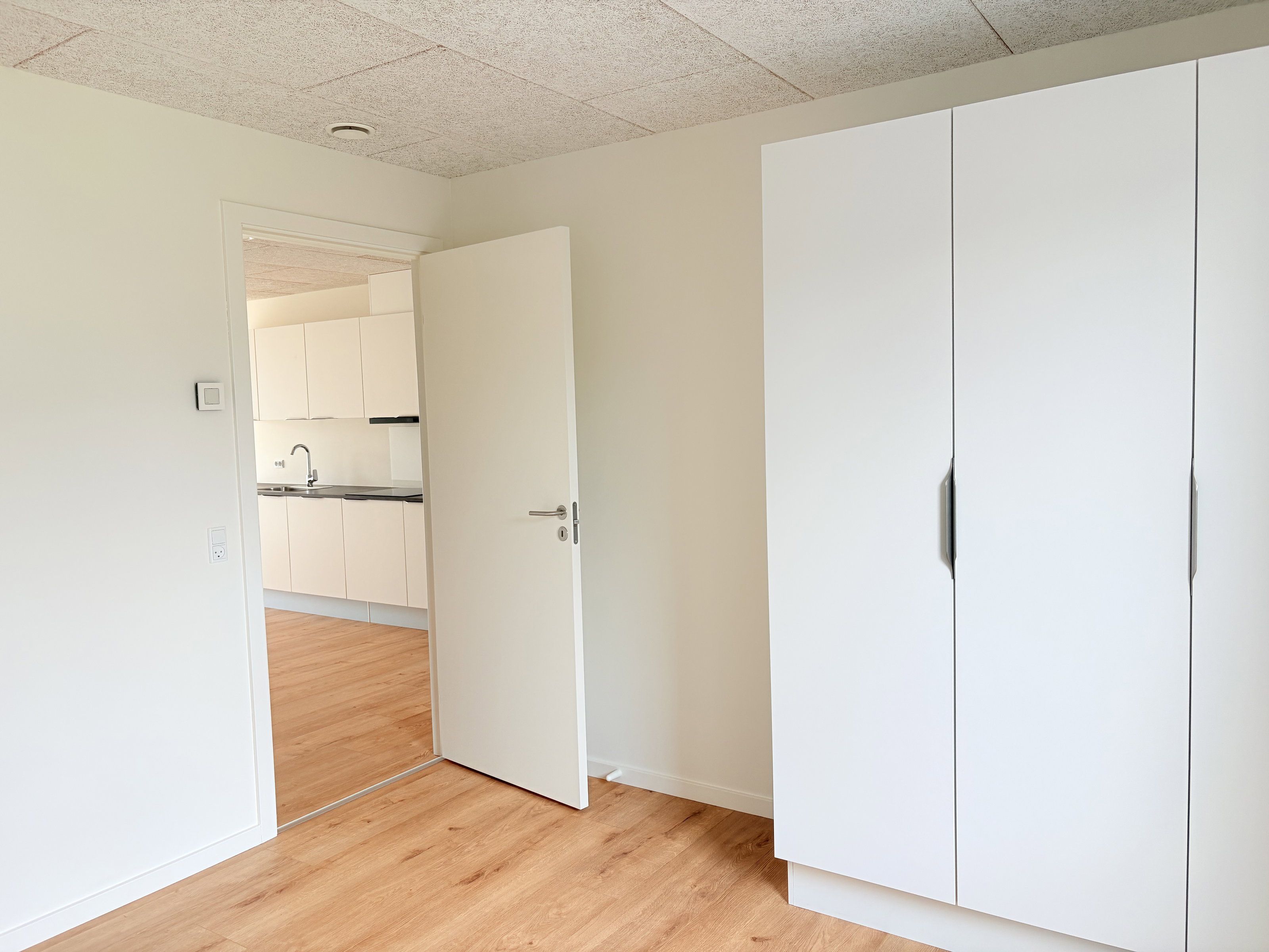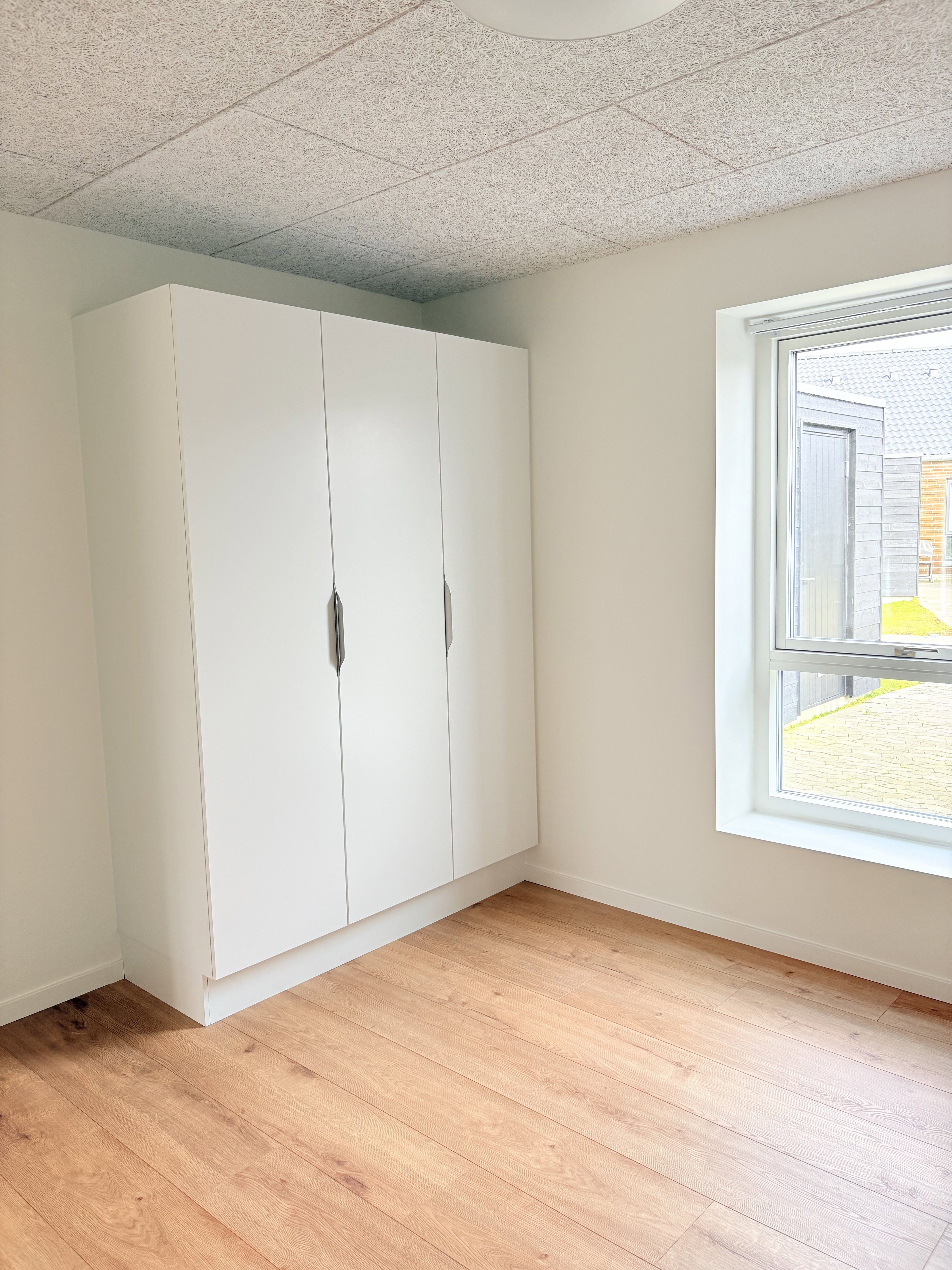 Rækkehuset rummer et lyst soveværelse med faste garderobeskabe, samt ét ekstra værelser med garderobe – perfekt som børneværelser, kontor eller gæsteværelse.