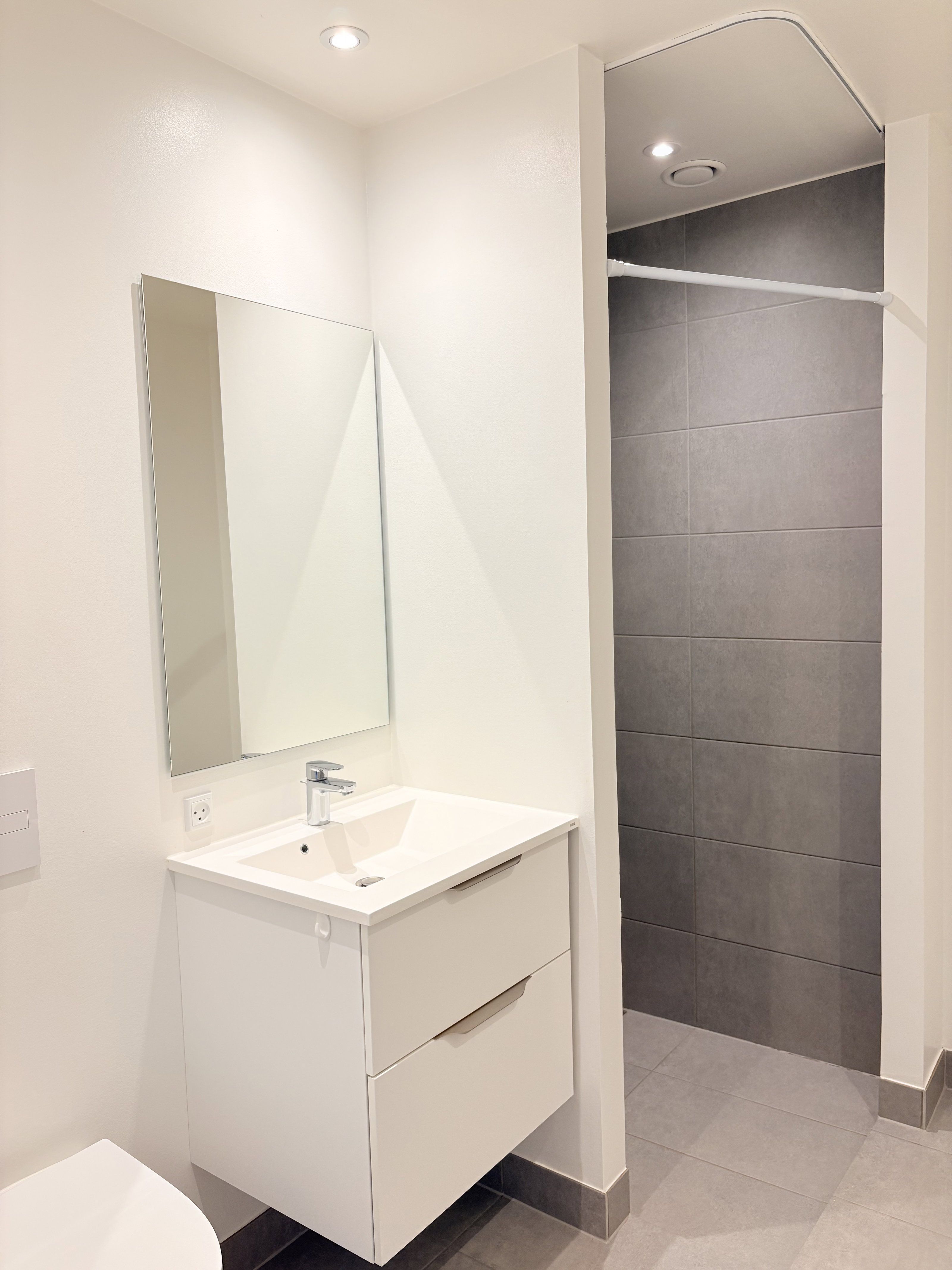 I entréen finder du et praktisk integreret bryggers med vaskemaskine og tørretumbler samt plads til opbevaring – en løsning, der gør hverdagen simpel og overskuelig. Badeværelset er opført i et stilrent og moderne udtryk med lyse klinker, separat bruseniche og funktionelle detaljer, der matcher resten af husets gennemførte stil.