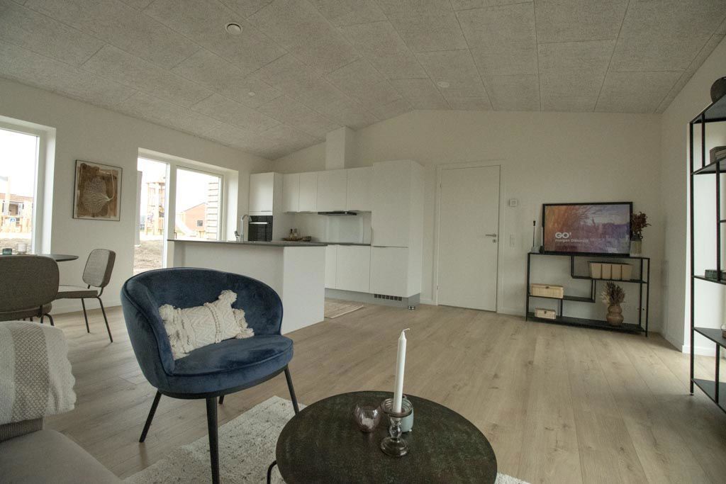 Drømmer du om at bo i et moderne og nyopført rækkehus i rolige og naturskønne omgivelser? Så er Valdemars Have i Voel lige noget for dig!🏡 Lyst og lækkert 3 værelses rækkehus i Valdemars Have i Voel. - Stort lyst køkken-alrum - Privat have med terrasse🌞 - Mulighed for at have dit husdyr med🐶 - Privat parkeringsplads - Eget skur - HTH Køkken med alt i hårde hvidevarer - Entre med vaskemaskine og tørretumbler - Boligen opvarmes med varmepumper - Der indlægges fiber i boligen Boligen har alt i hårde hvidevarer, et stærkt og vedligeholdelsesfrit laminatgulv samt egen terrasse og lille have. Køkken-alrum og stue Det store køkken-alrum med stue i forlængelse bliver et naturligt samlingspunkt i dette hjem. I køkkenet får du et hvidt og tidløst køkken fra HTH, som indeholder alt i hårde hvidevarer. I køkkenet er der også plads til et spisebord. I forlængelse af køkken-alrummet har du stuen, med både plads til chaiselong sofa og TV. Herfra er der direkte adgang til en privat terrasse og have som binder ude- og indelivet sammen. Værelser Boligen byder på 2 værelser alle med faste skabe og gulv til loft vindue som giver et dejligt lysindfald. Værelserne varierer i størrelse. Du får i denne bolig 1 værelse på 10,3 m2 og 1 værelse på 12,3 m2. Badeværelse Boligens badeværelse er med hvide badeværelseselementer fra HTH samt klinker i egetræslook. Som i boligens resterende rum har du også gulvvarme og ventilationsanlæg på badeværelset der er med til at sikre et sundt indeklima. Uderum Med et hjem i Valdemars Have har du på den ene side af huset adgang til en dejlig privat have med flisebelagt terrasse, hvor du kan nyde en kop kaffe i skønne omgivelser. På den anden side af huset har du et træskur, hvor der er god plads til opbevaring af f.eks. værktøj. Du får også 1 privat parkeringsplads foran huset, så der ikke er langt at gå med indkøbene. Der er naturligvis gjort klar til man selv må opsætte ladestander ved boligen