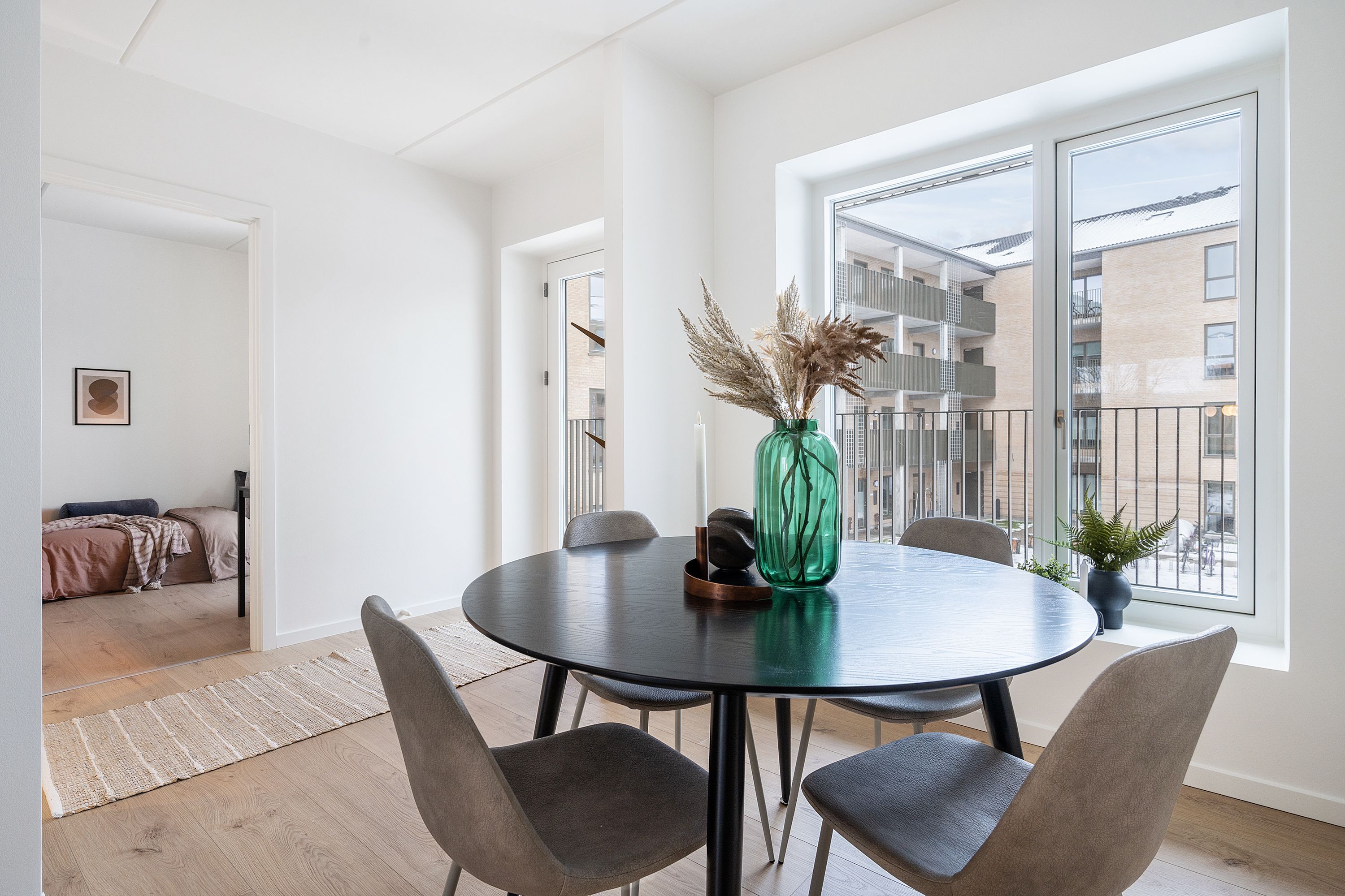 Rækkehuset er indrettet med et lyst og rummeligt køkken-alrum, der fungerer som boligens naturlige samlingspunkt. Herfra er der direkte udgang til terrasse på begge sider af boligen, hvilket skaber et flot lysindfald og en naturlig sammenhæng mellem inde- og udeliv. Derudover rummer boligen et soveværelse, et ekstra værelse, et badeværelse samt en rummelig kombineret entré og bryggers.