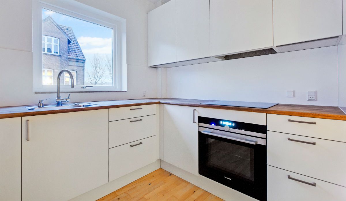 Lyst køkken/alrum med hårde hvidevarer med stålfront - kogeplade, ovn, emhætte, køl og frys. Masse af skabsplads med vedligeholdsvenlig bordplade. Det lyse klinkegulvet er nemt at holde i køkken og omkring spiseplads.