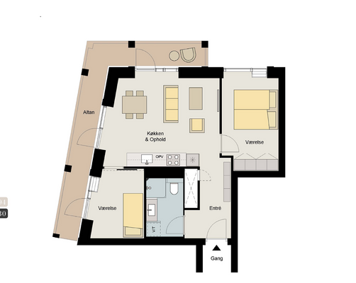 3 vær. lejlighed på 80 m²